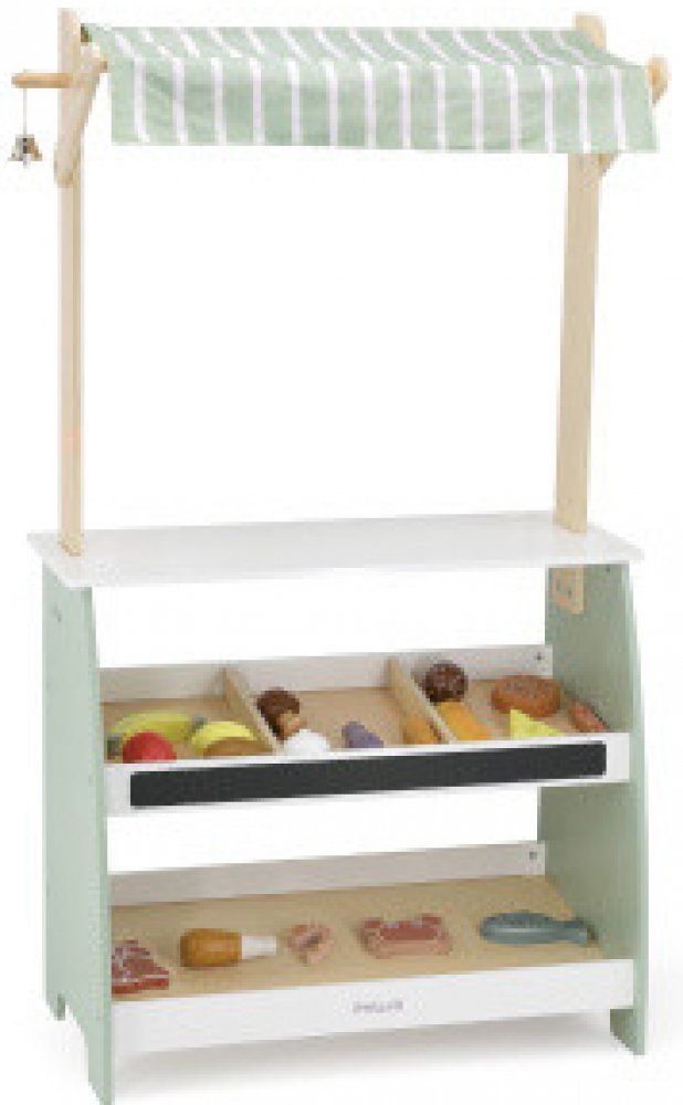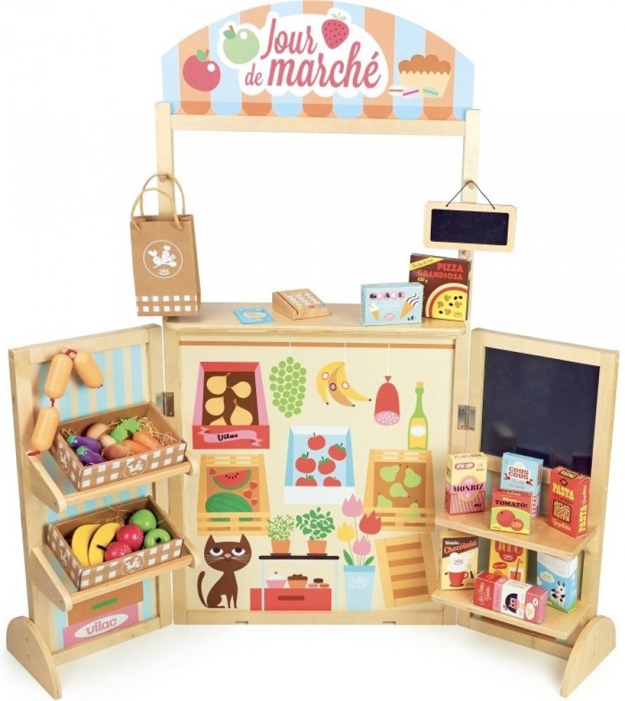 Dřevěný prodejní stánek značky Vilac. Obsahuje krabice zeleniny, ovoce a další produkty jako káva, čaj a jiné. Dále také terminál pro platbu kartou nebo tabule pro denní nabídku. Dohromady obsahuje 30 ks příslušenství.