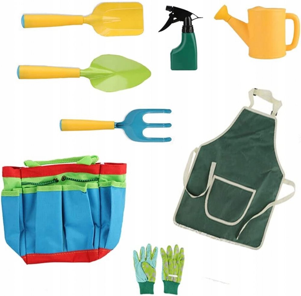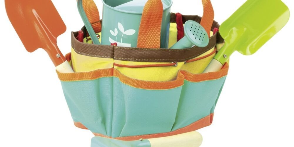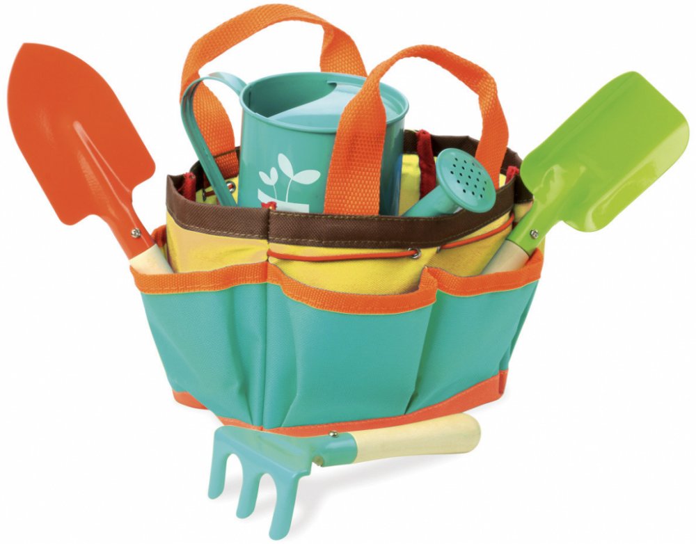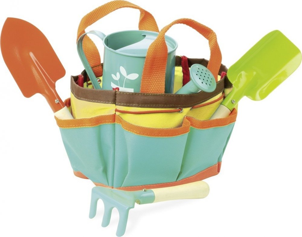 Krásný přenosný set malých zahradníků. Tento velmi kvalitní zahradnický set obsahuje lopatku, hrábě, rýč a konvičku. Taška se dá jednoduše vyprat, nářadí omýt vodou.
