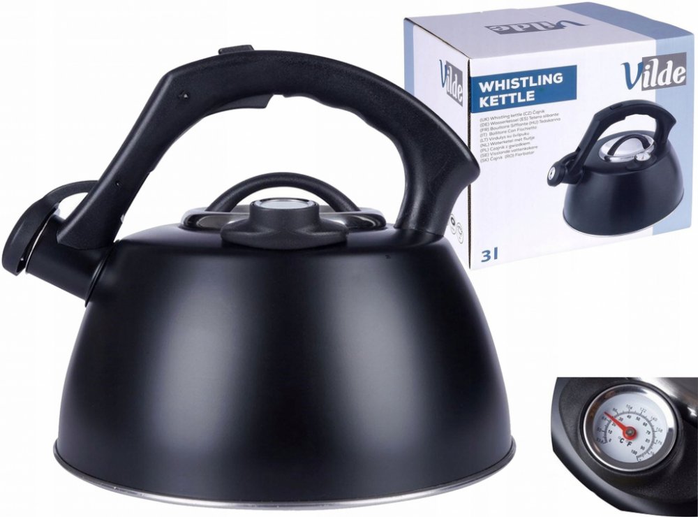 Konvice s teploměrem je vyrobena z nejkvalitnějších materiálů. Využijeme ho k uvaření vody na kávu, čaj nebo k vaření bylinek. Pohodlné použití díky rukojeti, víku a automatickému píšťalkování. Teploměr umožní přípravu čajů a bylin při vhodných teplotách: černý čaj je třeba vařit při teplotě 90-95 °C, zelený čaj 75-85 °C, bílý čaj 70-80 °C, žlutý čaj 80-85 °C, bylinný čaj 95-100 °C, bylinky je nejlepší vařit při teplotě 95 °C. Vodu v konvici uvaříme velmi rychle a její čištění je velmi pohodlné. Konvice je skvělým nápadem na dárek.