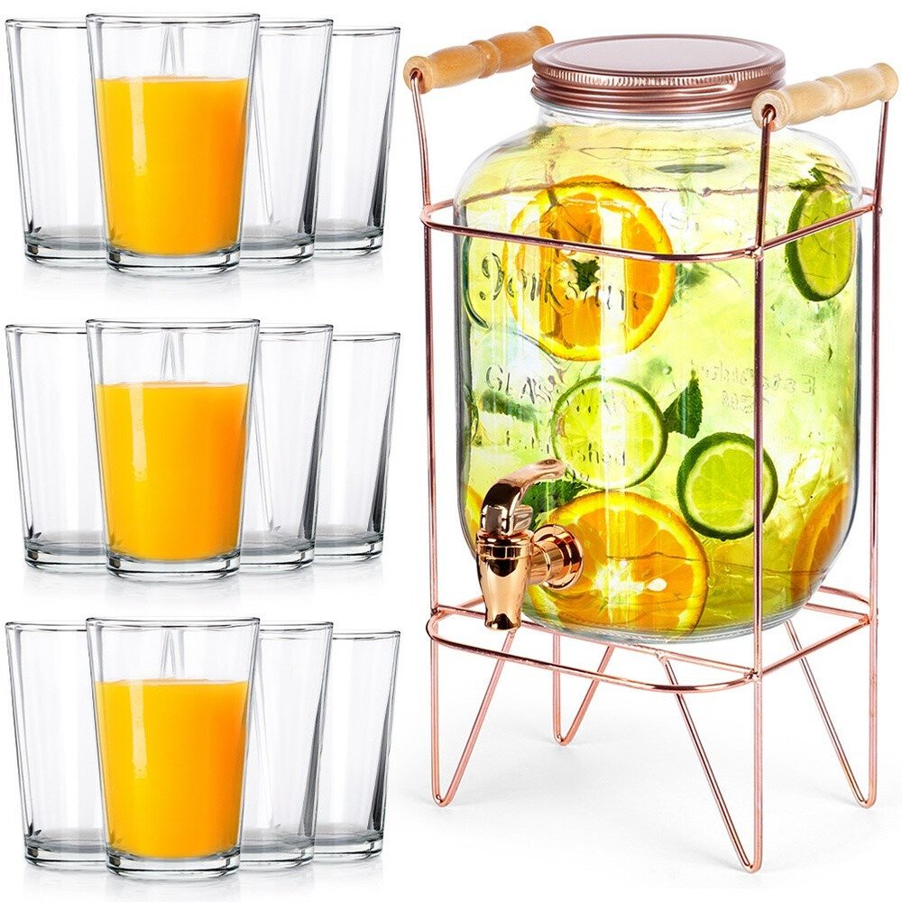 Sada se skládá ze sklenice s kohoutkem a stojanu na sklenice spolu s 12 sklenicemi. Ideální pro servírování vody, limonády, džusu, ledového čaje, ochucené vody, ale také punče. Sadu využijeme jak na zahradě, tak při rodinných setkáních. Díky uzavíratelnému víku se do našeho nápoje nedostane žádný hmyz. Je vyroben z materiálů bezpečných pro zdraví a neutrálních pro potraviny. Není vhodný pro horké nápoje. Pozor! Na obalu je uvedena chybná informace o kapacita nádoby, skutečná kapacita odpovídá výše uvedenému popisu. Originální výrobek značky Vilde. Vyrobeno v souladu s evropskými normami.