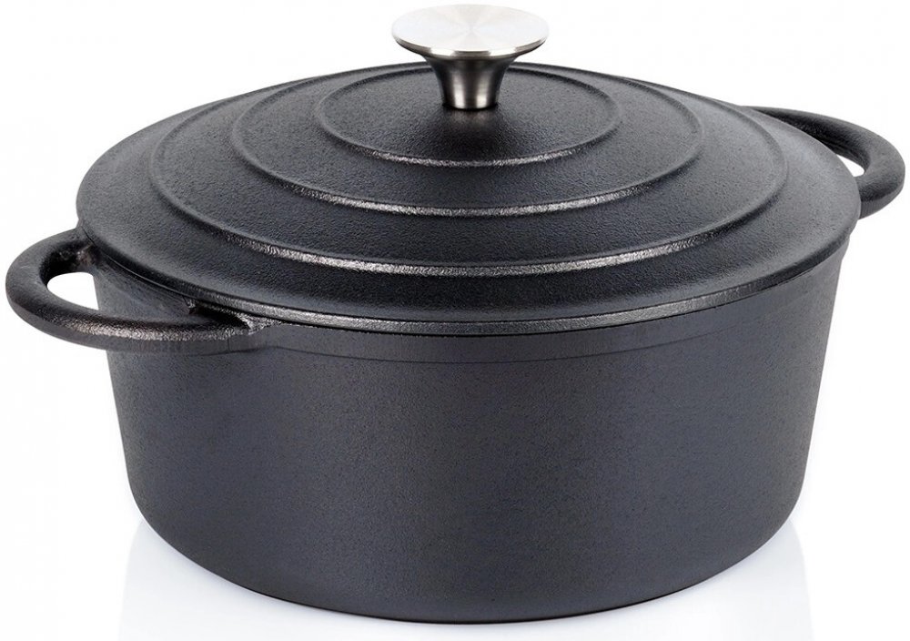 Robustní litinový hrnec s poklicí o objemu 2,6 l je ideální pro pomaleé dušení, pečení i vaření na všech typech sporáků včetně indukce. Litina zajišťuje rovnoměrné rozložení tepla a jeho dlouhé udržení, takže pokrmy zůstávají déle teplé a šťavnaté. Praktické boční úchyty a poklice s nerezovým knobem usnadní manipulaci doma, na grilu i při kempování.