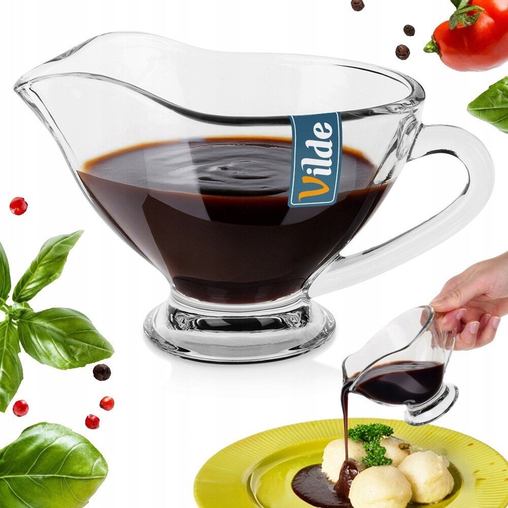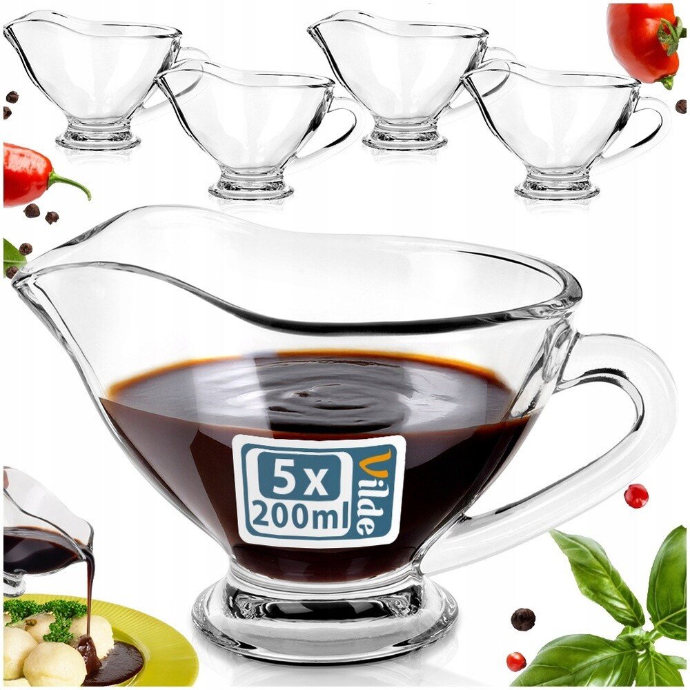 Sada pěti skleněných omáček se skvěle hodí pro podávání omáček k masu, zeleniny a rybám, dezertních omáček, polev na koláče nebo vafle a také jako konvička na mléko nebo smetanu do kávy. Kombinují klasický design s pohodlím při používání a harmonicky ladí s jakýmkoli nádobím. Originální výrobek značky Vilde. Vyrobeno v souladu s evropskými normami.