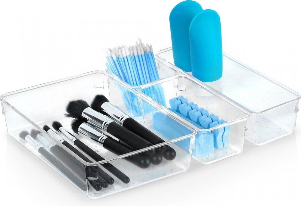 Pořiďte si tuto praktickou sadu 4 průhledných akrylových organizérů, které vám pomohou udržet pořádek na toaletním stolku, v zásuvce nebo skříňce. Elegantní a univerzální design se hodí do jakéhokoli interiéru – od klasického po moderní. Perfektní volba pro uložení kosmetiky, šperků, nebo drobných předmětů.