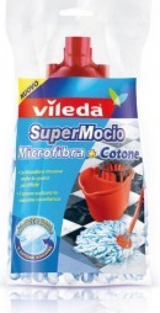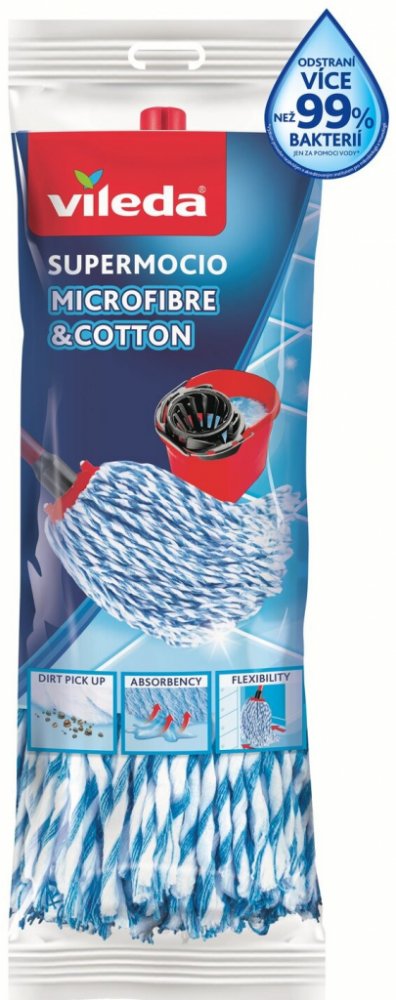 SuperMocio Micro + náhradní bavlna - 151665náhradní mop SuperMociokombinace mikrovlákna a bavlny pro snadné čištěnívysoká savost, dobře stírá nečistotyvhodný pro všechny typy tvrdých podlahnenechávejte ho schnout na podlaze, dejte ho do kbelíku nebo hlavou nahoru, aby uschnullze prát na 60 °Cnepoužívejte změkčovadla tkaninpraní při nižších teplotách 40 °C prodlouží životnost tkaniny a také sníží d...