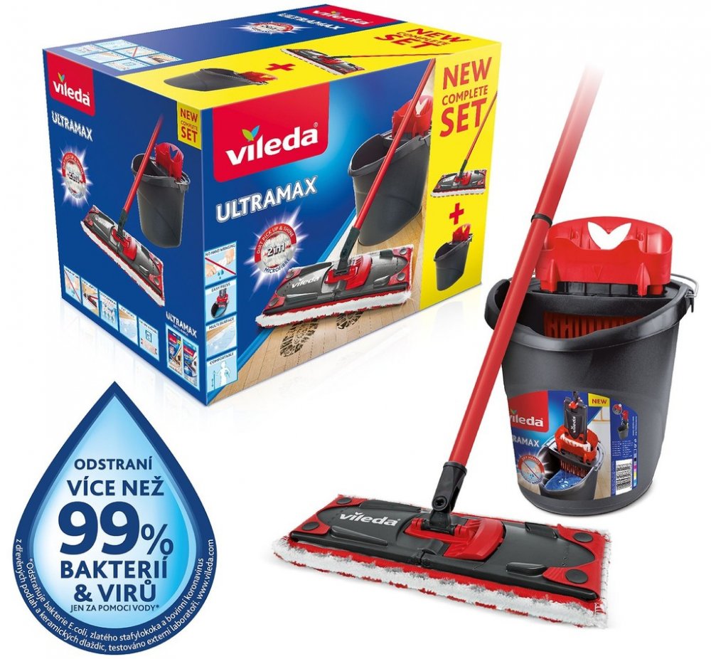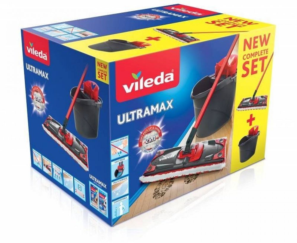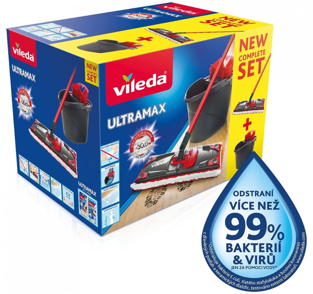 Set v krabici obsahuje Ultramax mop s návlekem Microfibre a kýbl se ždímacím košem.