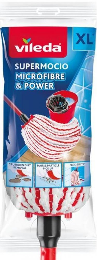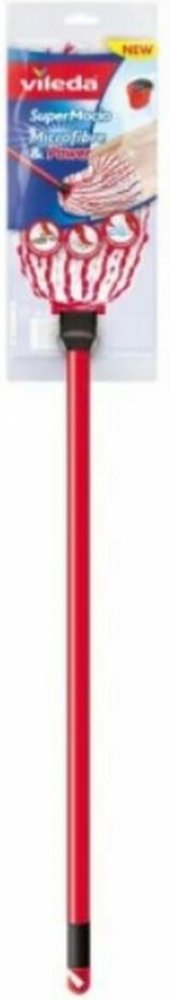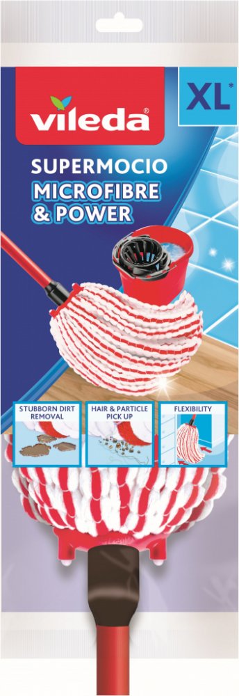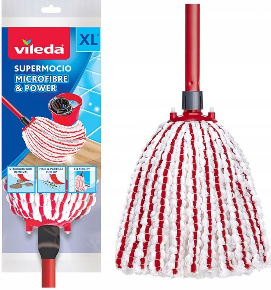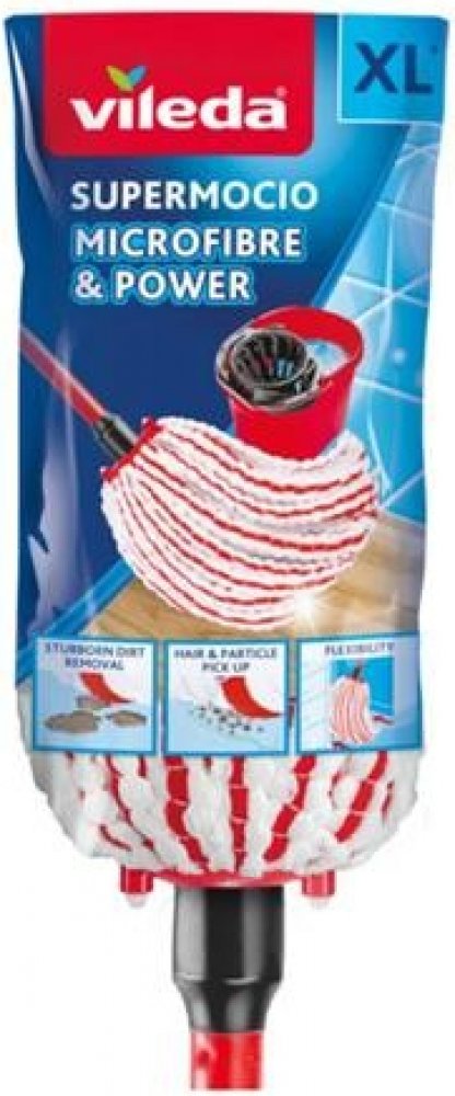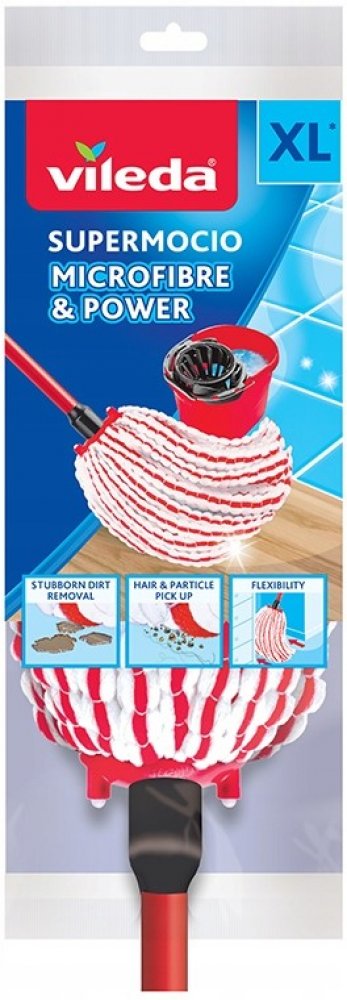 Robustní, ale flexibilní mop z mikrovláken Vileda SuperMocio Microfibre & Power je super účinný, pokud jde o odolné nečistoty a skvrny. Dlouhé bílé třásně z mikrovláken v kombinaci s červenými dělají z mopu vynikajícího pomocníka, který dokáže odstranit oleje, vlasy, částice i lepivé skvrny. Součástí mopu není kbelík. Vlastnosti: - Červená abrazivní vlákna Červená abrazivní vlákna jsou speciálně navrženy tak, aby zaručovaly lepší čisticí výkon mopu Vileda SuperMocio. Zachytávají vlasy a další částice, které by normálně zůstaly na vaší podlaze. - Dlouhá rukojeť Kovová rukojeť mopu má dél