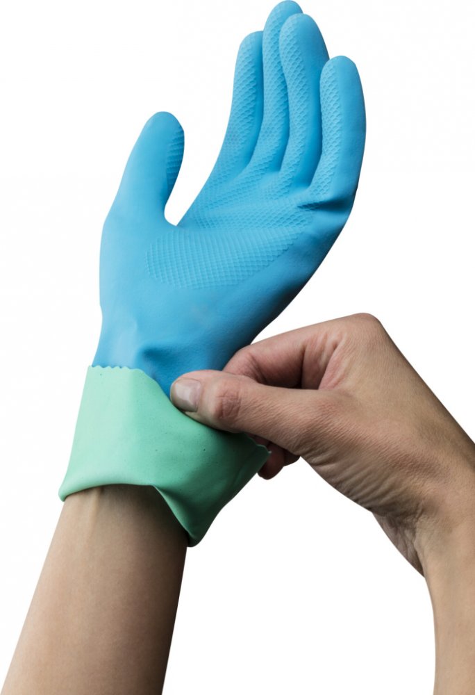 Použití: Rukavice nasaďte na suché ruce. Po skončení práce opláchněte vnější povrch vodou, obraťte naruby a nechte vyschnout. Skladujte na suchém místě, mimo zdroje tepla. Při práci s čisticími prostředky se řiďte pokyny jejich výrobce.