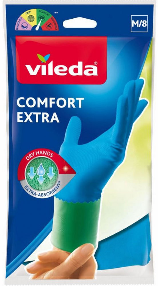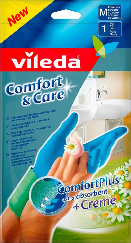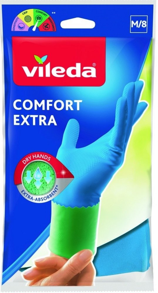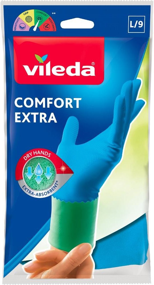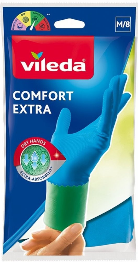 Gumové domácí rukavice VILEDA Comfort & Care jsou navrženy pro pohodlný a bezpečný úklid. Speciální vnitřní výstelka absorbuje vlhkost, udržuje ruce suché a přispívá k příjemnému nošení i při delší práci. Výstelka je napuštěna heřmánkovým krémem, který pokožku během úklidu ošetřuje. Rukavice mají osvěžující vůni, poskytují antibakteriální ochranu a díky odolné latexové konstrukci jsou vhodné pro všechny běžné domácí práce včetně mytí nádobí, úklidu kuchyně nebo koupelny. Tvar je přizpůsoben pohodlnému uchopení a jistému držení předmětů i ve vlhkém prostředí.