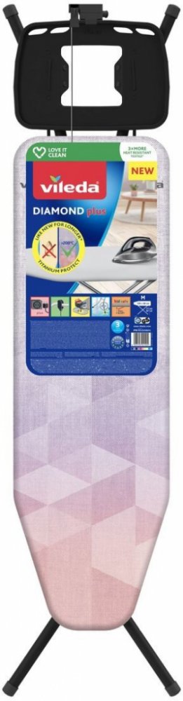 Pořiďte si žehlicí prkno VILEDA DIAMOND PLUS, které má velkou žehlicí plochu a potah s titanovou vrstvou. Velká odkládací plocha se zásuvkou a držákem kabelu je vhodná pro žehličky s parním generátorem i parní stanice. Je mimořádně pevné a stabilní, přitom se snadno rozkládá i skládá. Konstrukce je doplněna dětskou pojistkou, která zabraňuje složení prkna při náhodném nárazu. Rozměry a parametry: délka - 120 cm šířka - 38 cm výška pěnové podložky - 0,8 cm minimální výška - 77 cm maximální výška - 97 cm hmotnost - 5,98 kg rozměry po složení: 169 cm x 44 cm x 5 cm nastavitelná výška držák na žehličku zásuvka s kabelem Materiál: textil, plast, kov Barva: viz foto Použití: domácnost TIPY A VÝHODY Potah žehlicího prkna Vileda Diamond je potažen titánovou vrstvou, která mu dodává tepelnou odolnost vyšší než 200 °C - díky tomu má delší životnost. Pokud vás už nebaví připálená nebo zažloutlá žehlicí prkna a chcete mít dokonalý zážitek z žehlení, toto je řešení pro Vás. Velká kovová plocha (se zásuvkou a držákem kabelu) je vhodná pro žehličky s parním generátorem i parní stanice. Je stabilní a bezpečně stojící, s extra silnými kulatými nohama o průměru 28 mm. Nastavitelná výška a bezpečnost - ideální pro všechny výšky. Žehlicí prkno Diamond M má nastavitelnou výšku až do 97 cm a je vybaveno dětskou pojistkou, která zabraňuje složení prkna při náhodném nárazu. Široká nabídka značky VILEDA obsahuje různé druhy mopů, k nim patřící náhrady, sušáky a jiné.