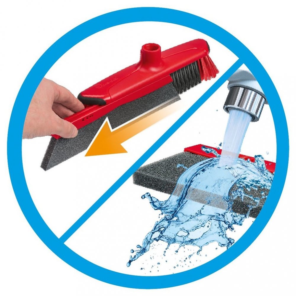 Snadno se čistí - má možnost snadného vyjmutí houbičky pro čištění: plastový prvek s houbičkou stačí vysunout z kolejniček, vyčistit a vrátit zpět díky gumovým koncovkám základny kartáče, nepoškozuje stěny popř. nábytku při úklidu.