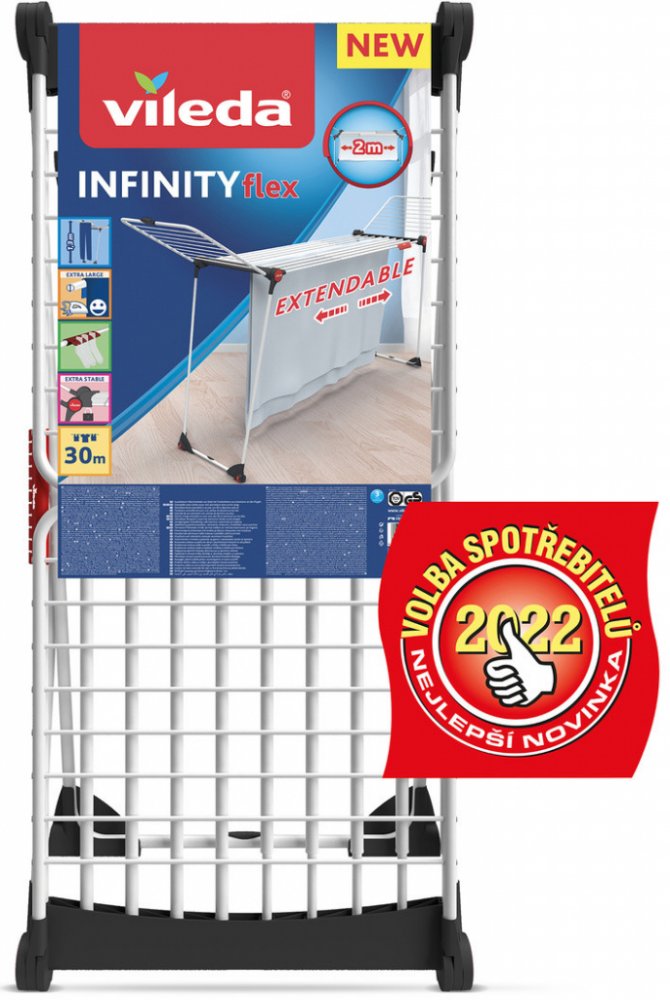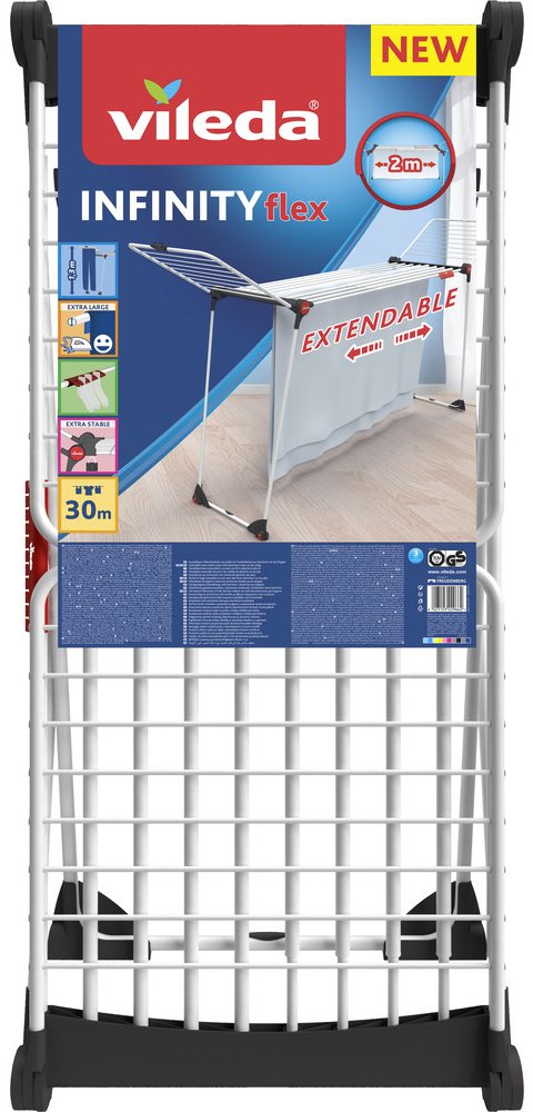 Sušák Vileda Infinity Flex je vyroben z oceli a hliníku a může být použit jak v interiéru, tak i v exteriéru. Nicméně, po použití jej uložte zpět dovnitř, abyste prodloužili jeho životnost, protože špatné počasí by mohlo ocel poškodit. Sušák na prádlo je vybaven dvěma kolečky, která vám umožní sušák snadno přemisťovat, i když je plně naložený. Po použití lze Vileda Infinity Flex snadno složit a uložit díky bezpečnostnímu zámku křídel.