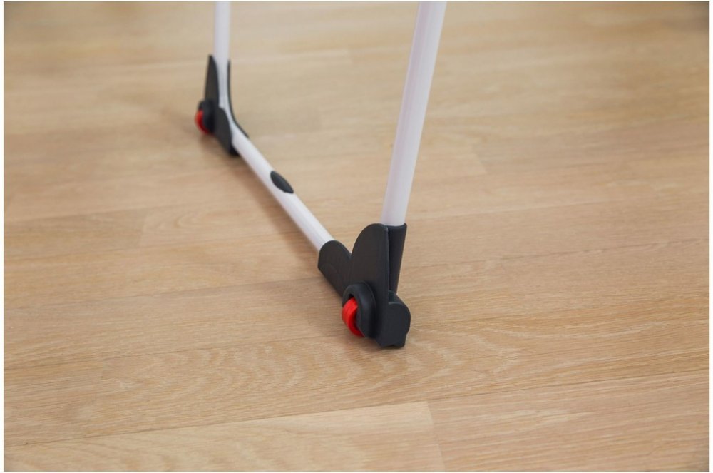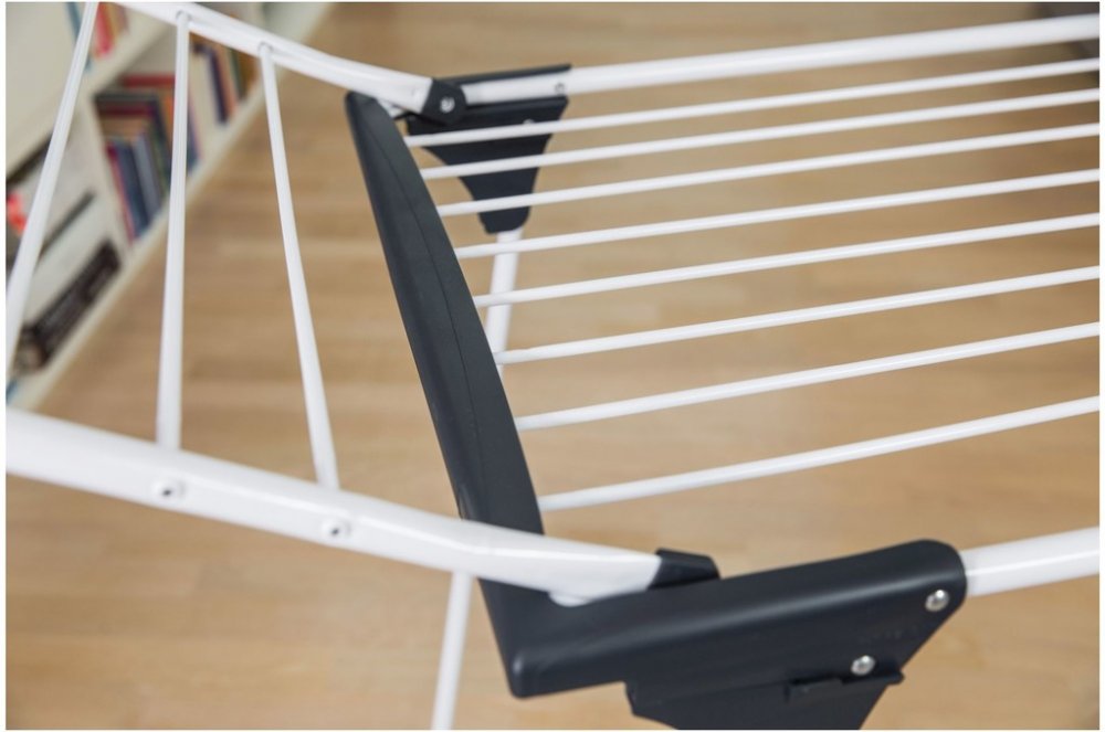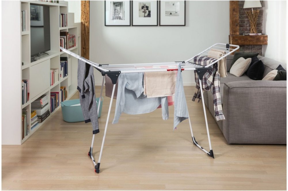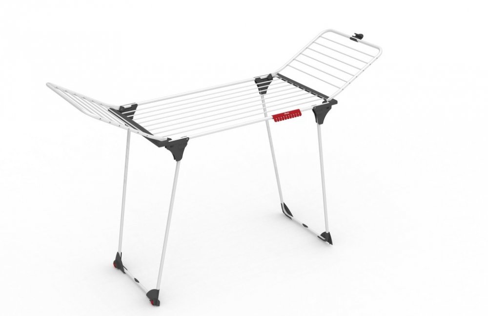 Robustní rozkládací sušák na prádlo nabízí až 20 m sušící plochy. Opatřen silnými hliníkovými dráty, kolečky, zámkem křídel a držákem pro malé předměty.