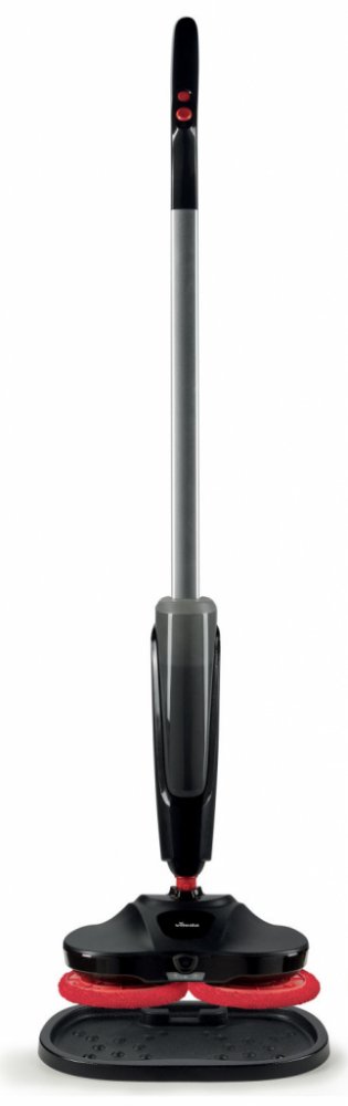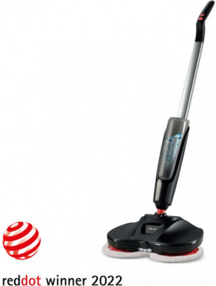 Dvě proti sobě se otáčející hlavice s návleky z mikrovlákna s rozstřikem vody před mop