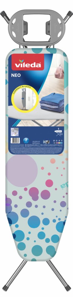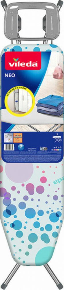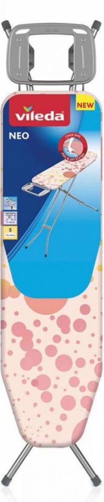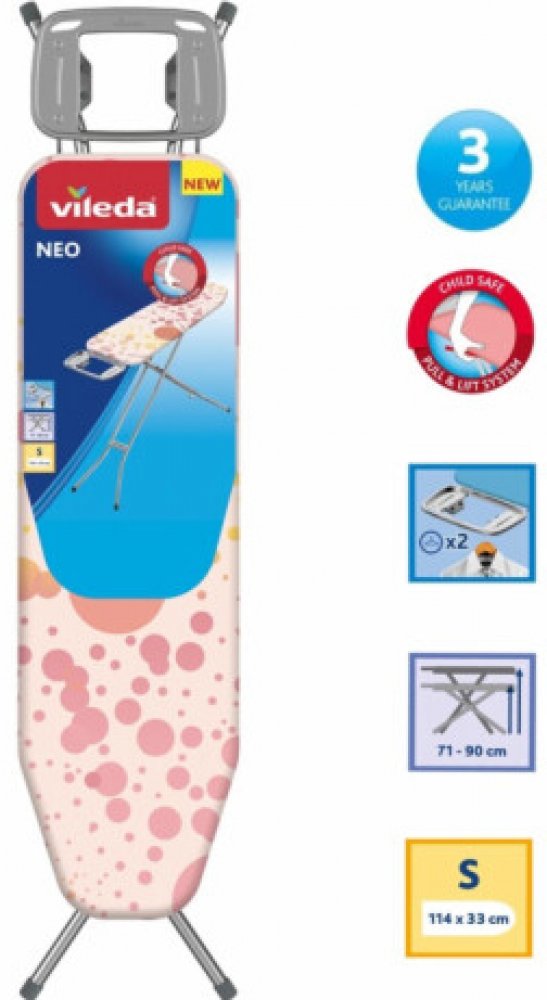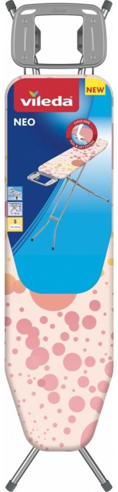 Žehlicí prkno Vileda NEO S je kompaktní, bezpečné a velmi praktické pro menší prostory. Je vybavené žehlicí plochou o rozměrech 114 × 33 cm, což je ideální pro pohodlné žehlení běžného prádla i větších kusů, jako jsou trička a kalhoty. Prkno má navíc odolný 100% bavlněný potah s pěnovou podložkou, která zajišťuje plynulé žehlení a zároveň propouští páru, což zamezuje hromadění vlhkosti během žehlení. Prkno je vybaveno bezpečnostním dětským zámkem, který zamezuje náhodnému složení prkna během používání, což je ideální pro domácnosti s dětmi. Dalším bezpečnostním prvkem jsou protiskluzové nožky, které zajišťují stabilitu i na hladkých površích. Praktická odkládací plocha se silikonovými podložkami je vhodná pro uložení žehličky i závěsů na ramínka. Jeho nastavitelná výška od 71 do 90 cm umožňuje přizpůsobit prkno každému uživateli, což zajišťuje pohodlné používání bez bolesti zad. Navzdory své robustní konstrukci váží pouhých 4,5 kg, což usnadňuje manipulaci a skladování. Prkno také disponuje transportním zámkem pro snadné přenášení. Celkově je Vileda NEO S skvělou volbou pro každodenní žehlení díky své stabilitě, bezpečnostním prvkům a snadné přenosnosti