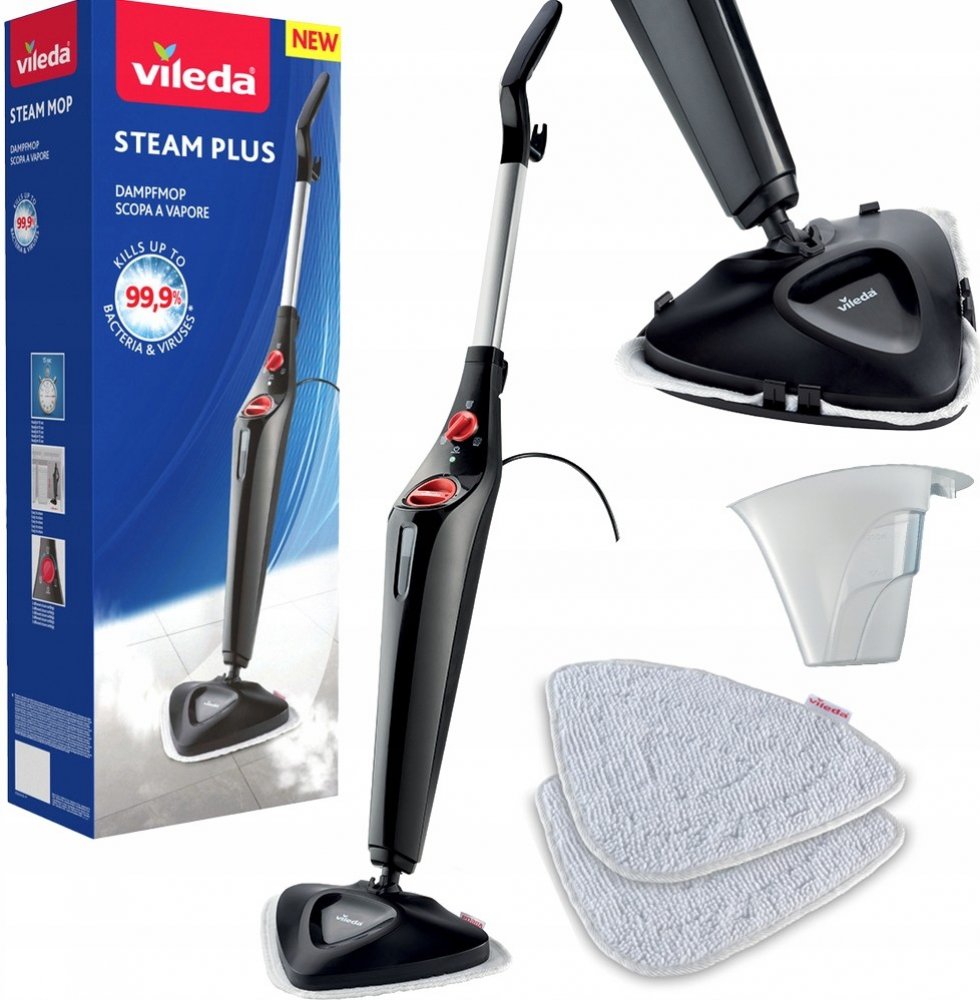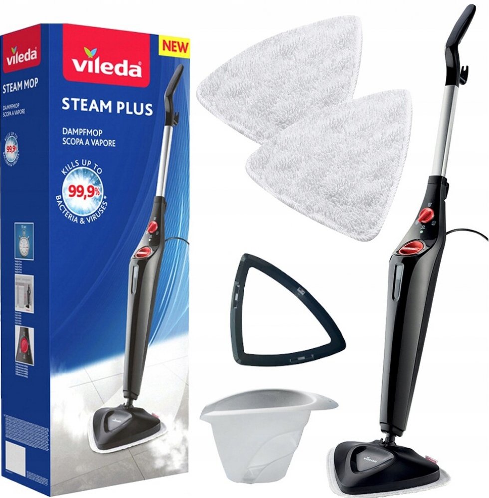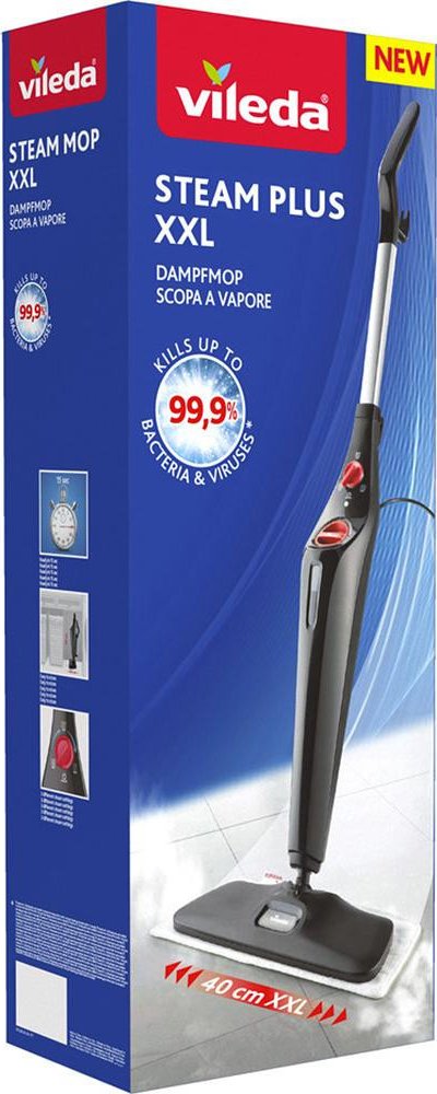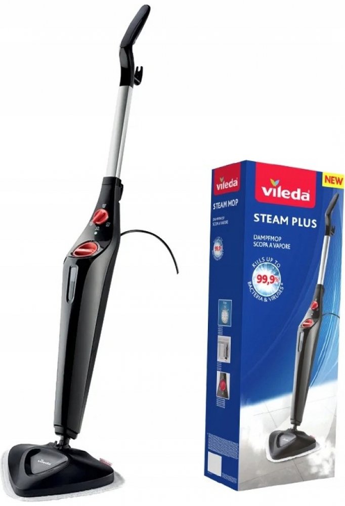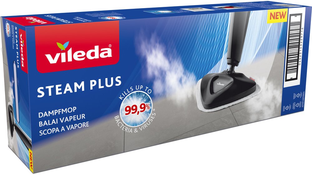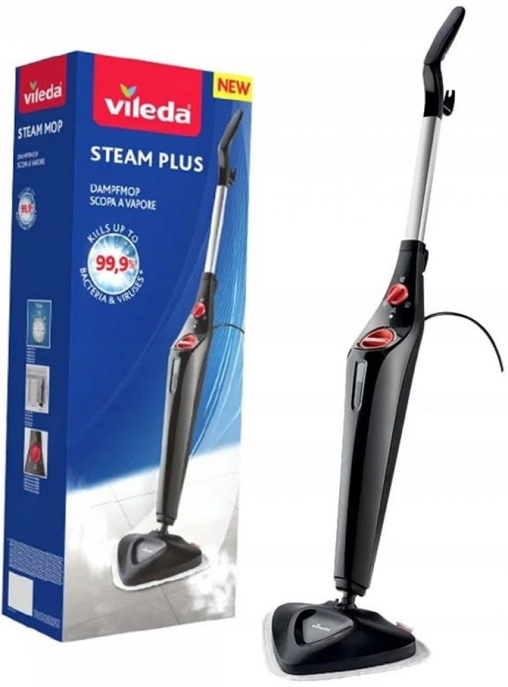 Nově navržený Vileda Steam PLUS parní mop má vysoký výkon a je snadno ovladatelný, kompaktní, lehký a vybaven otočnou trojúhelníkovou hlavicí mopu. Je dlouhý 126 cm a váží 2,3 kg. Ergonomická rukojeť umožňuje snadné a pohodlné držení parního mopu. Díky jeho kompaktnímu tvaru a konstrukci snadno a rychle klouže v rozích, pod nábytkem a v malých prostorech. Praktická funkce klouzání po kobercích vám také pomůže osvěžit koberce a předložky. Pokud hledáte ještě větší parní mop pro ještě účinnější pokrytí povrchu, můžete se podívat na náš parní mop Vileda Steam PLUS XXL. Odstraňuje bakterie E.coli a S. aureus a bovinní koronavirus z utěsněných dřevěných podlah a keramických dlaždic, jak bylo testováno v laboratoři třetí strany.