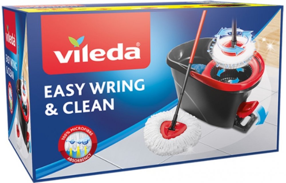 Vileda® Úklidová sada Easy Wring and Clean Vlastnosti Kompletní sada obsahuje mop Easy Wring s 3dílnou teleskopickou rukojetí; 2 potahy a vědro se ždímacím košem Odstraní až 99 % bakterií jen pomocí vody – odstraňuje E. coli a S. aureus z dřevěných podlah a keramických dlaždic (testováno nezávislou třetí stranou) Díky rotační síle při odstřeďování se nečistoty a voda odstředí do vědra Šetří čas a chrání ruce a záda Optimální vlhkost mopu lze individuálně přizpůsobit Použitelný na všechy typy podlahových krytin, také na parkety a laminátové podlahy Pratelná hlava mopu z mikrovlákna je velmi savá a odstraňuje snadno i mastné nečistoty – perfektní výsledky čištění bez šmouh Pohodlné čištění i v rozích místnosti Charakteristika produktu ;} Materiál: plast; nerezová ocel, ocel Příslušenství: vědro; rukojeť, hlava mopu z mikrovlákna Povrch: parkety; laminát; dlaždice Teleskopická rukojeť: ano