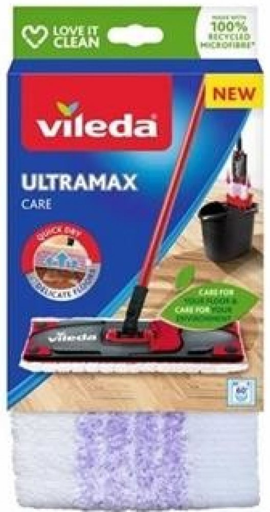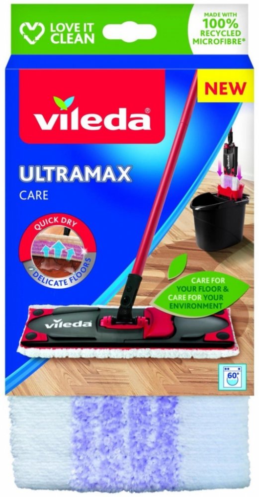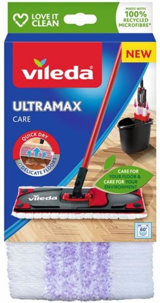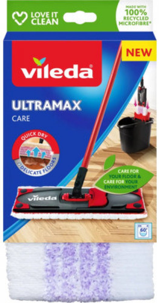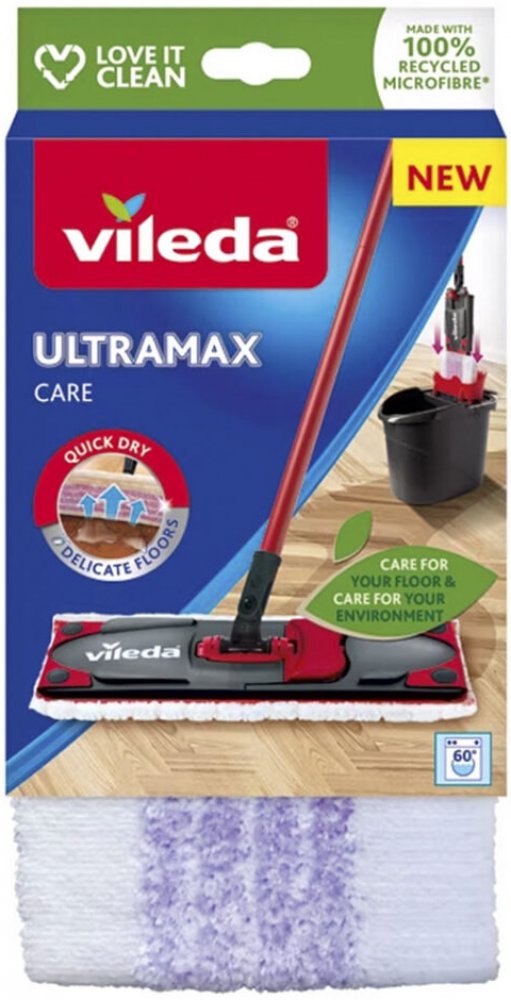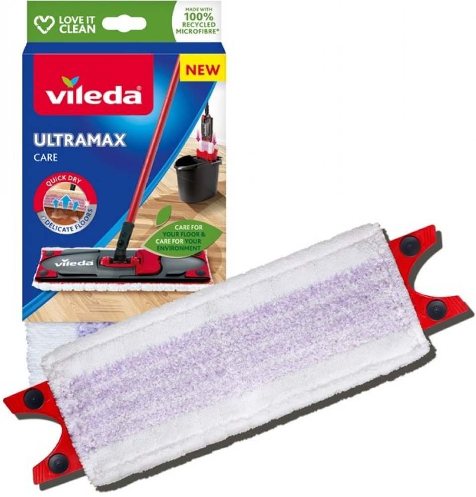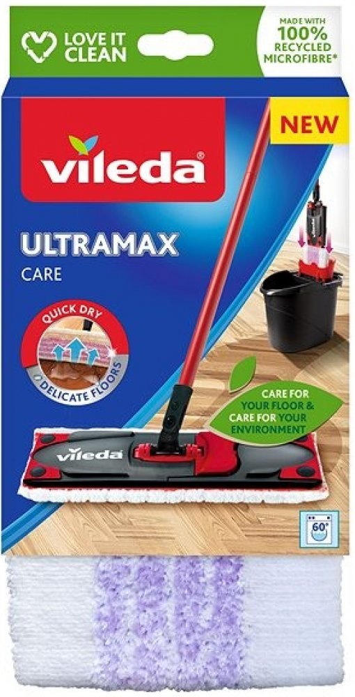 Návleky na mopy mají obecně dlouhou životnost, pokud jsou prané a používané správně. Návleky však nejsou věčné. Doporučuje se vyměnit starý návlek za nový každých 6 měsíců. Zjistíte-li, že jsou na návleku tmavší skvrny, které nelze vyprat nebo vyždímat, doporučujeme si pořídit nový návlek. Náhradní návlek Ultramax Care lze snadno připevnit pomocí cvočků na mopy Ultramax a Ultramax Turbo. Mycí návlek na mop Vileda Ultramax je určen zejména pro čištění delikátních podlah. Jeho jedinečné složení zanechá při čištění na vašich podlahách méně vody. Podlahy tak rychleji schnou a zároveň je zajištěno, že nedojde k poškození dřevěných podlah, jako jsou parkety, laminát nebo jiné běžné netěsnící dřevěné podlahy. Fialová vlákna náhradního mycího návleku Vileda Ultramax Care čistí nečistoty a zachytávají i vlasy. Bílá vlákna a vysoce kvalitní 100% recyklovaná mikrovlákna vaše podlahy rychle vysuší a zanechají je lesklé. Návlek je pratelný v pračce s podobnými materiály do 60 °C bez aviváže a změkčovadel.