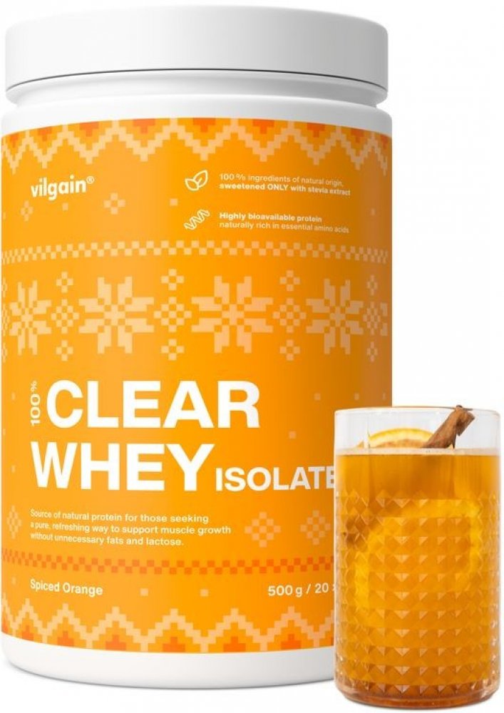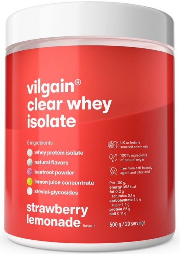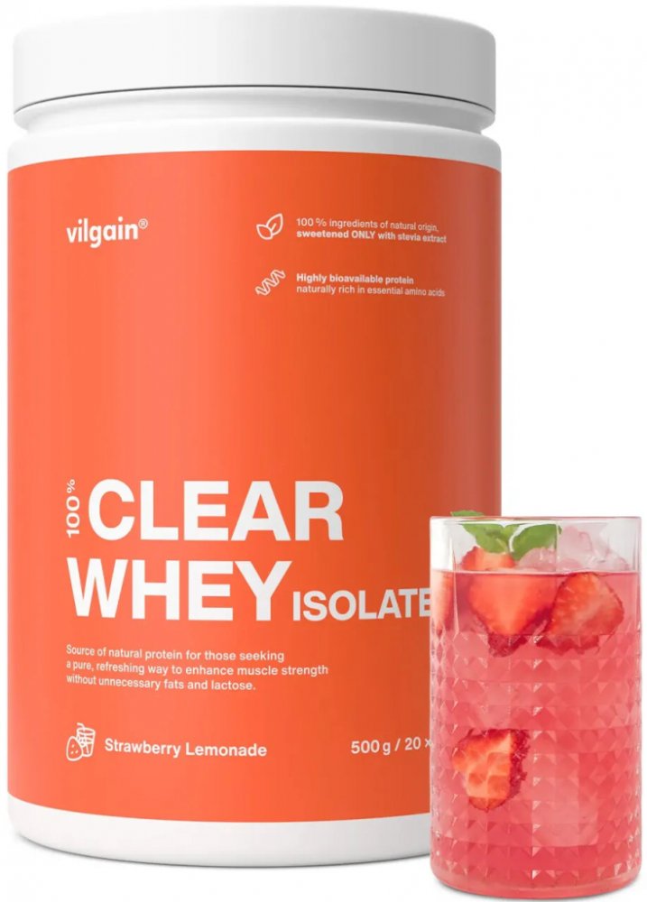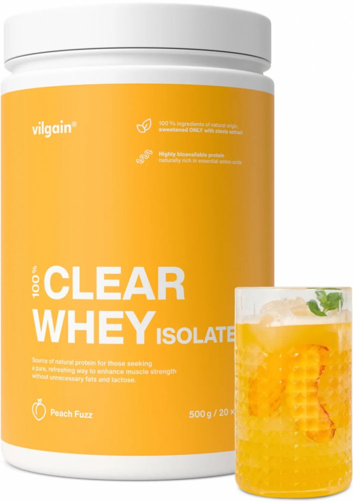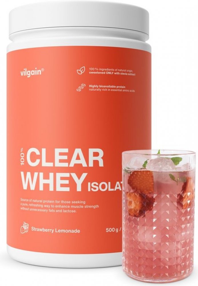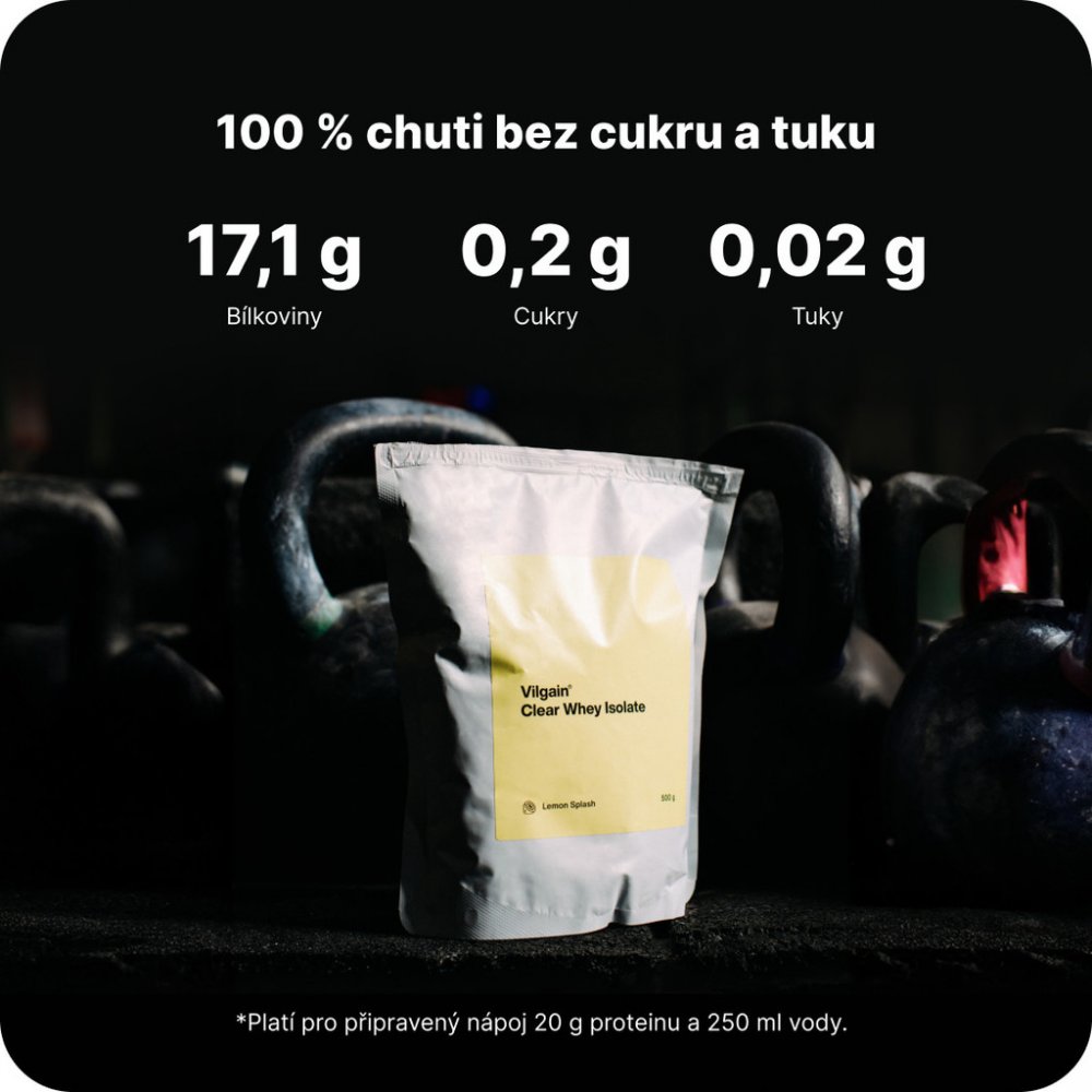 Vilgain Clear Whey Isolate je 98 % clear syrovátkový izolát slazený přírodními steviol‑glykosidy. Pít se dá kdykoliv, ale nejlépe se ho vychutnáš jako pořádně vychlazený letní drink, bez mléčné struktury a s chutí ovocné limonády.