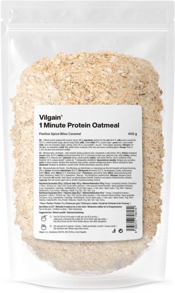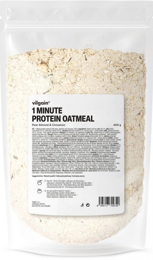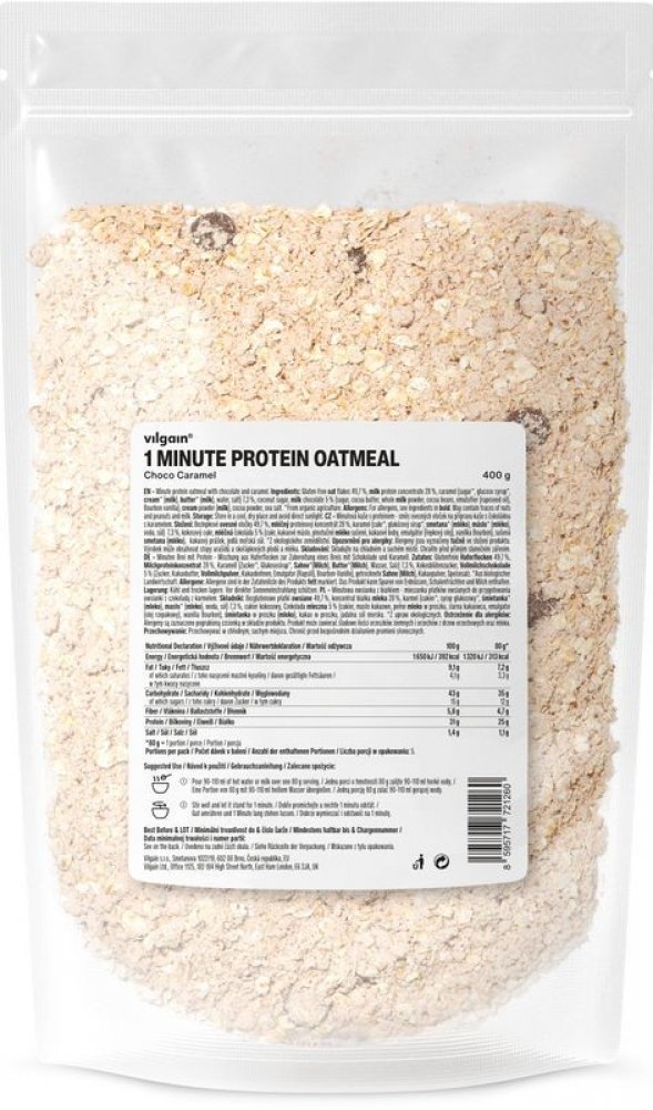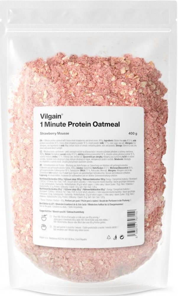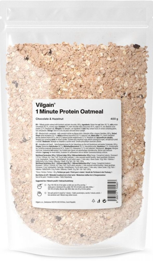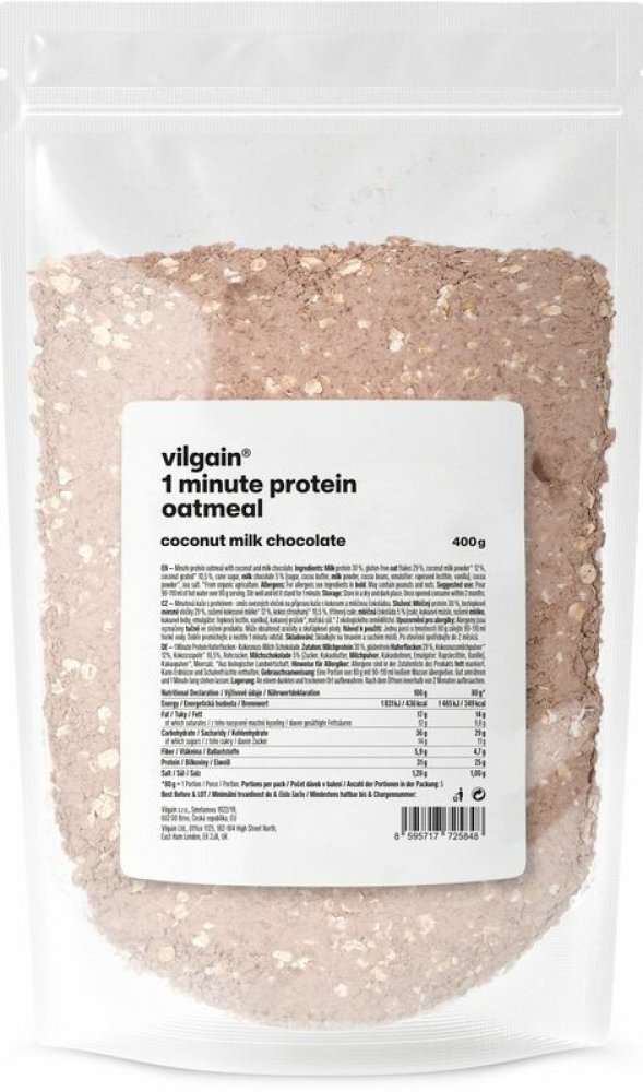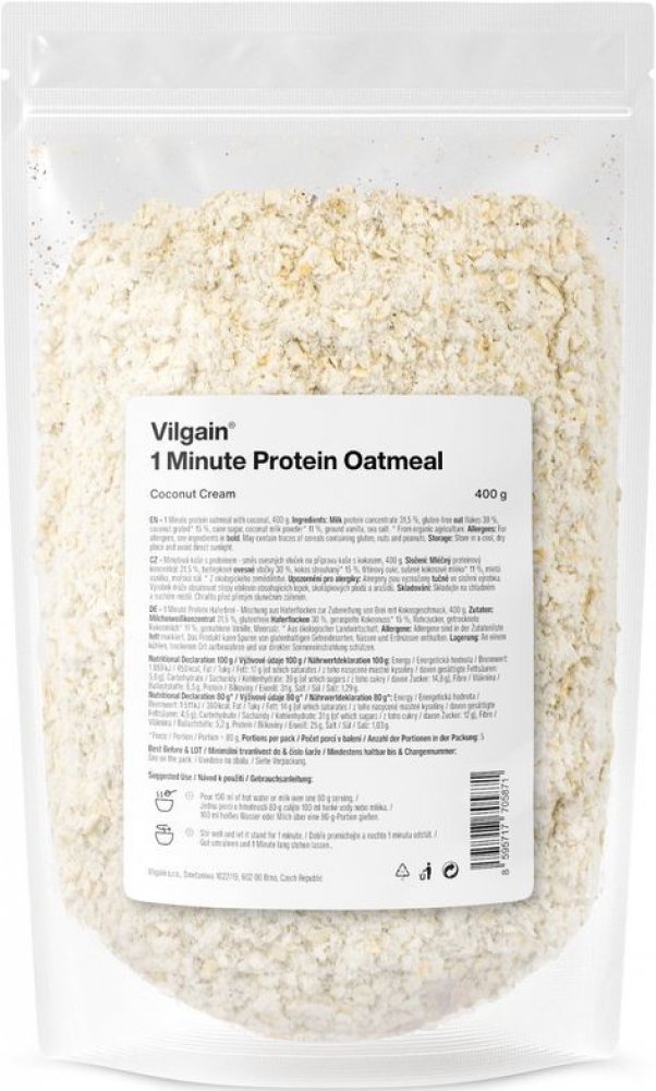 Vilgain 400 s vysokým obsahem bílkovin v prášku – více porcí 5.2 g mléčný protein, bezlepkové ovesné vločky, kokos 1 min 5 ks oves