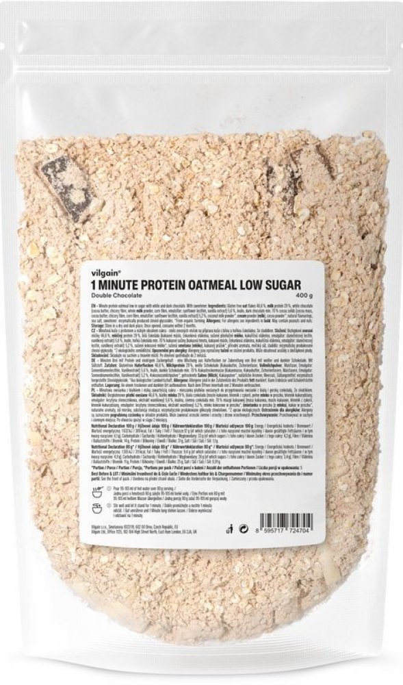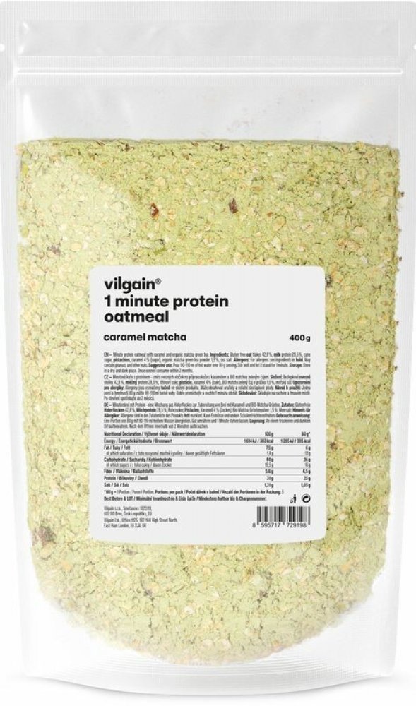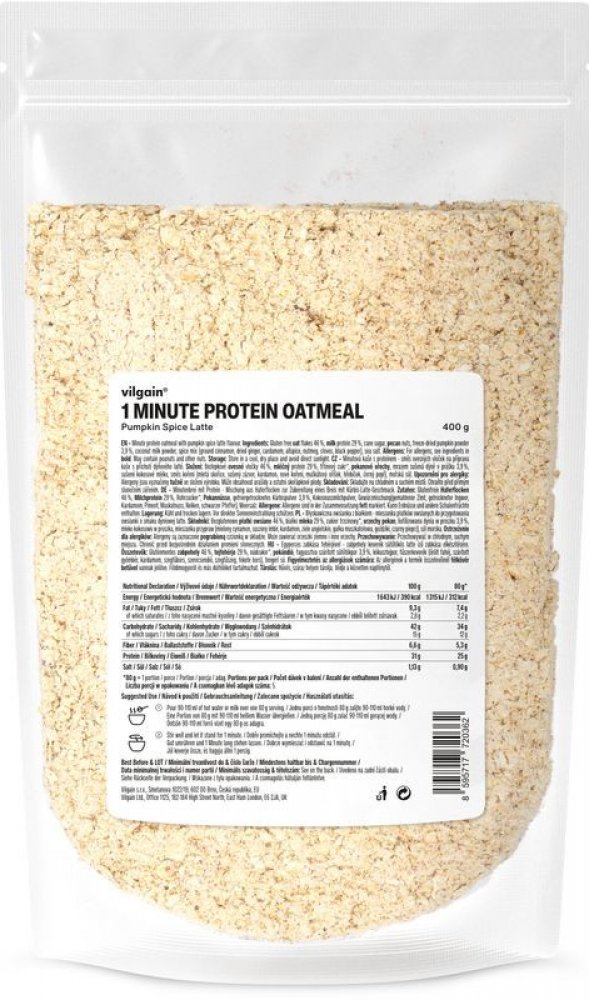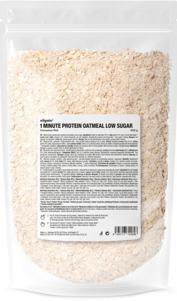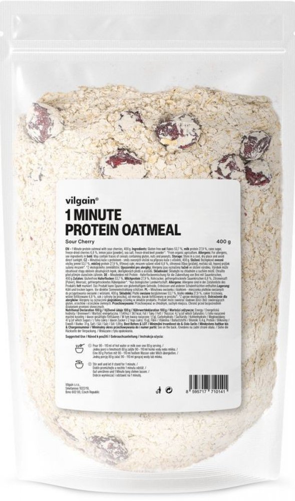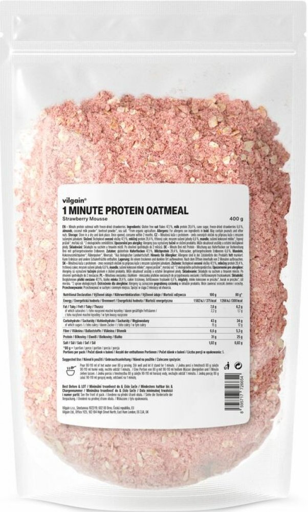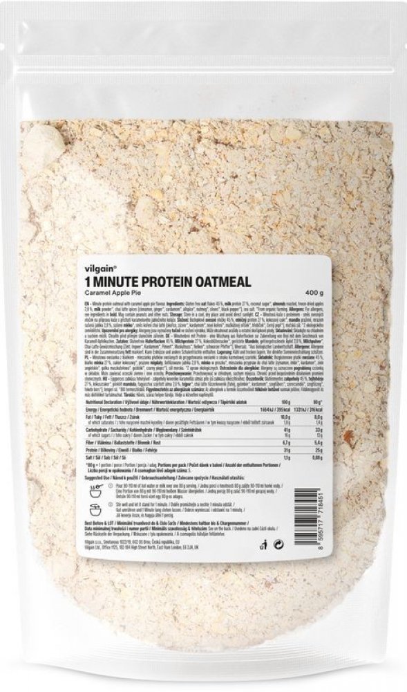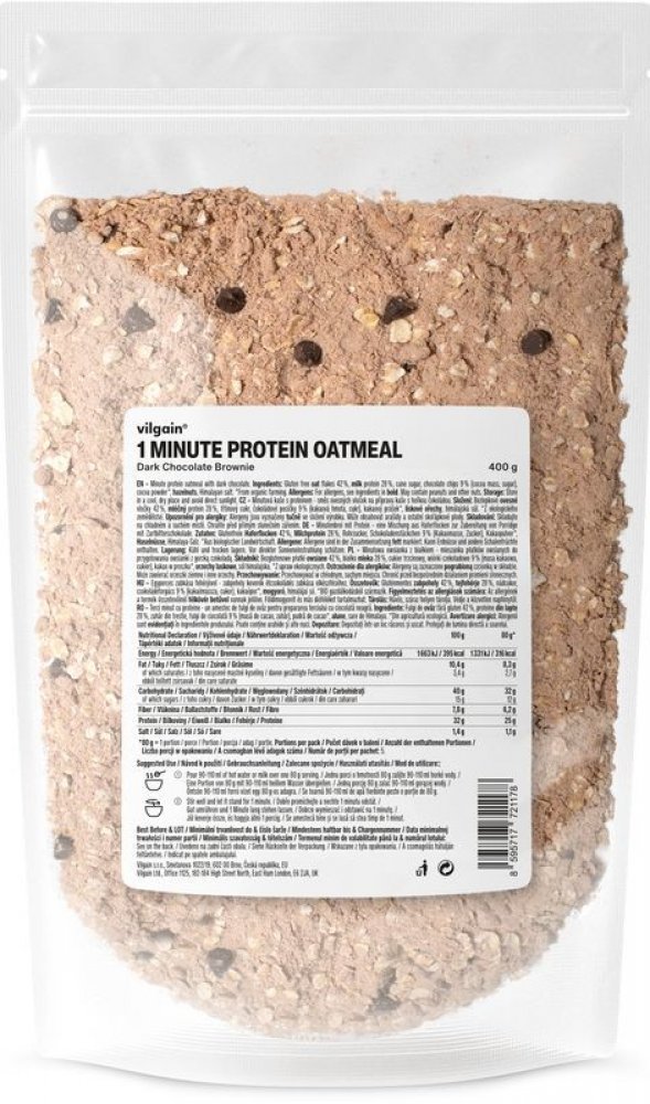 Vilgain 400 s vysokým obsahem bílkovin v prášku – více porcí 5.2 g mléčný protein, bezlepkové ovesné vločky, kokos 1 min 5 ks oves