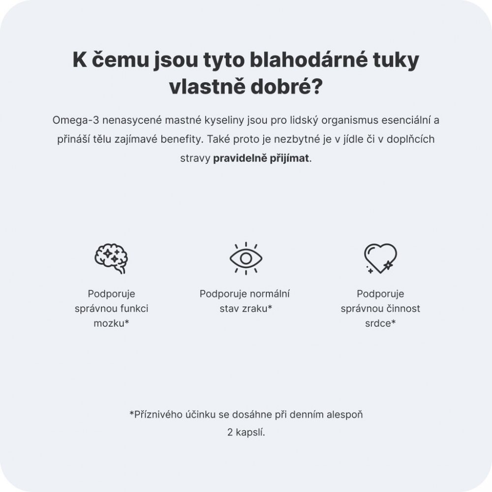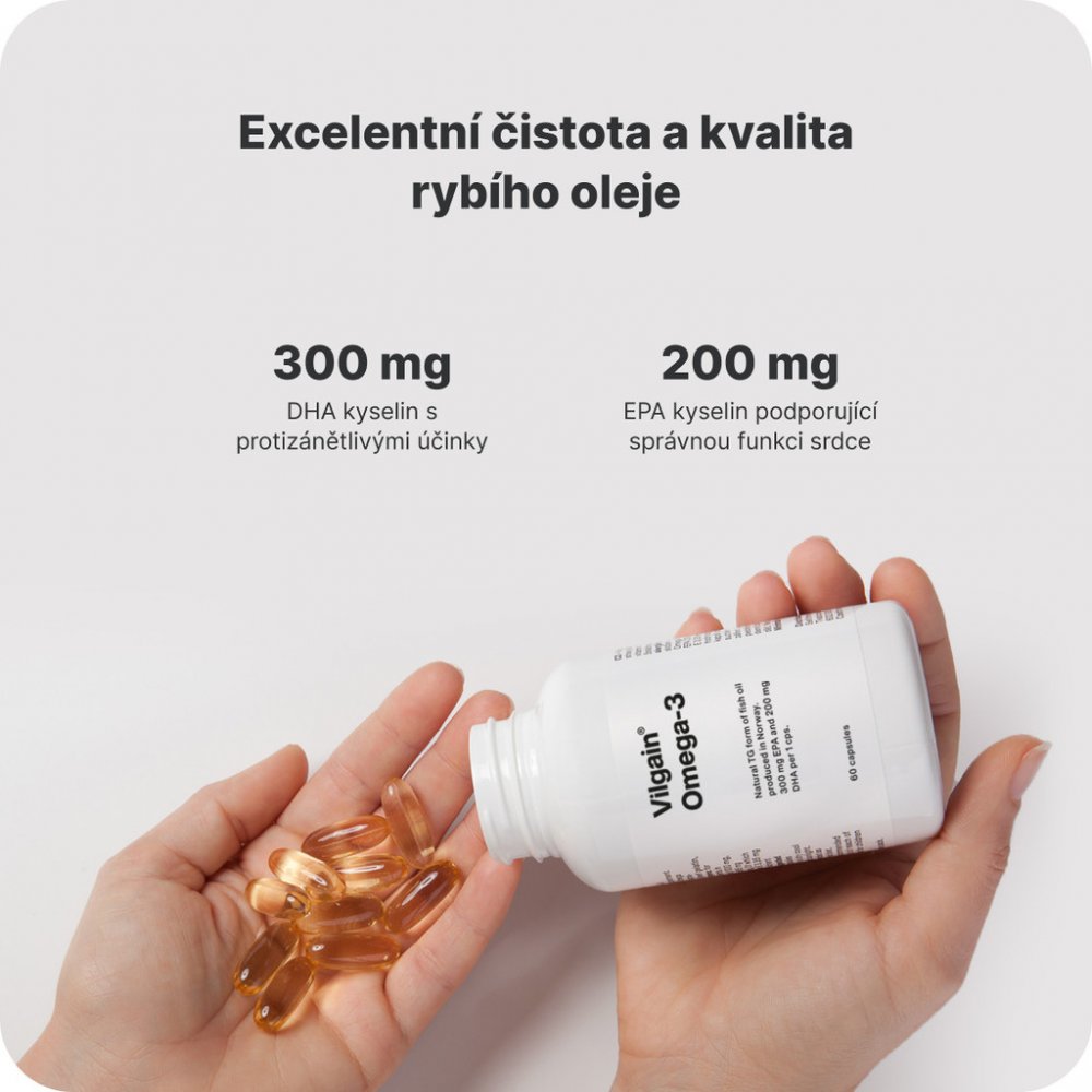 Vilgain Omega-3 – přirozená forma triglyceridů, vysoká oxidační stabilita, EPA a DHA přispívají k udržení normálního stavu zraku, činnosti mozku a srdce