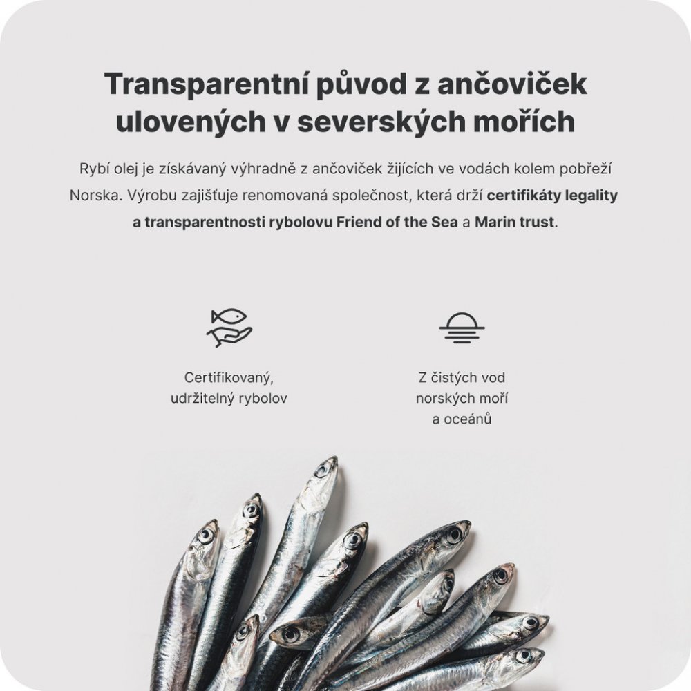 Rybí olej z ančoviček získaných z udržitelného rybolovu