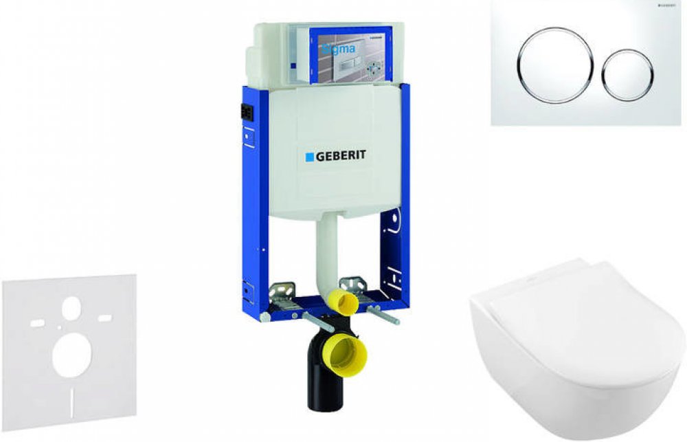 Sada předstěnové instalace, klozetu, WC sedátka a ovládacího tlačítka Obsahuje předstěnový instalační modul Geberit Kombifix (110.302.00.5), se splachovací nádržkou pod omítku Sigma 12 cm soupravu pro tlumení hluku (SP 156SET) závěsný keramický klozet Villeroy & Boch Subway 2.0, včetně Slim WC sedátka (5614R2R1) DirectFlush technologie bezokrajového splachování AquaReduct technologie pro úsporu vo...