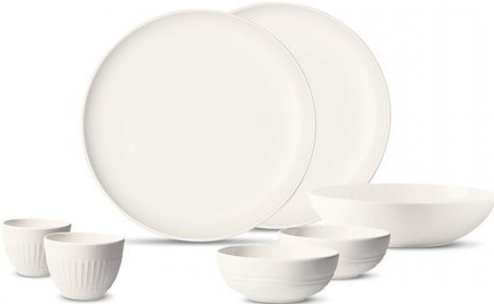 Sada porcelánu z trendy kolekce nejen pro mladé - it´s my match německé porcelánky Villeroy & Boch obsahuje 7 ks: 2x jídelní talíř, 2x misku, 2x hrnek bez ouška a 1x servírovací mísu. Vše v bílém provedení, misky, hrnky a mísa jsou pak navíc zdobeny reliéfním dekorem.
