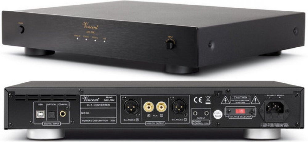 Převod digitálních hudebních souborů bravurně zajistí DAC Vincent s vlastním stabilizovaným zdrojem. Značka kreativity S německými kořeny je spjata značka Vincent. V bavorském regionu leží městečko Iffezheim a tam sídlí centrála společnosti Sintron Audio, ke které se váže export a distribuce značek Vincent, Tube Amp Company ( T.A.C. ), Dynavox, Thorens, Dual, Focal a dalších. Elektroinženýrovi Uwe Bartelovi se podařilo v roce 1994 sestavit kreativní pracovní tým, schopný realizovat smělé myšlenky. Touží nabídnout milovníkům věrného zvuku poctivé high-end komponenty mimořádných kvalit v dosažitelné cenové hladině. Není třeba šetřit na kvalitní součástkové základně a puritánské konstrukci, funguje to. Od roku 1995 ukazuje značka Vincent, co umí, přičemž výrobce se aktivně podílí na vývoji nových produktů. Začátky Nejdříve se zrodil elektronkový předzesilovač SA-1 a koncový stupeň D-150. Jeho věrný, avšak nenucený zvuk veřejnosti neunikl. Posléze došlo k dalšímu rozšíření sortimentu o modely konstruované z hliníkových plátů, nové HDCD přehrávače a zesilovače plně symetrických konstrukcí, což značce Vincent zajistilo uznání a obdiv audiofilů, a nejen jich. Skvěle nastavený DAC Jmenuje se Vincent, DAC-1MK v plně symetrickém provedení převádí digitální hudební soubory s maximální vzorkovací frekvencí 32 bit / 384 kHz (DSD) s dekodérem ES9038, který zpracovává signál (plně vyvážený) do analogové sekce. Má k dispozici tři digitální vstupy - Coax, Optical a proti původní oblíbené verzi DAC-1 také asynchronní USB s podporou Hi-Res Audio DSD. Analogová část je plně symetrická a je možné volit mezi výstupem RCA - Cinch nebo XLR. Převodník nemá žádný spínaný zdroj, jenž by mohl být zdrojem vysokofrekvenčního rušení. Právě naopak - disponuje vlastním stabilizovaným zdrojem s dvojitým toroidním oddělovacím transformátorem. Výrobce nastavil koncept tak, že jedno sekundární vinutí využívá pouze pro napájení digitálních obvodů a druhé vinutí pro analogovou část převodníku. Tímto způsobem je řešen, respektive omezen vliv analogové sekce digitální části a nastaven kladný vliv na podání dynamiky i nízko-úrovňových signálů. Detaily a zajímavosti Jak to funguje? Vnitřní kovové odstínění digitálních vstupů s vlastním DA čipem (propojené na celokovové šasi) a zemnící kolík brání průniku rušivých VF signálů z okolního prostředí, způsobených Wi-Fi, DBV-T atd. DAC je osazen jakostními součástkami renomovaných značek (MKP kondenzátory WIMA, polovodiče Burr Brown, Texas Instrumens, Nichicon). Je také doporučeno využití stíněných napájecích kabelů PANGEA AC14SEMKII, které mohou ještě více podpořit podání prostorovosti a vzdušnosti. Specifika a parametry Technická dokumentace uvádí vzorkovací frekvenci koaxiální, optickou PCM 24 bit / 192 kHz (DSD 64). Vzorkovací frekvence USB je PCM 32 bit / 384 kHz (DSD 256). Funkční frekvenční odezva udává 20 - 20 000 Hz (+/- 0,5 dB) a celkové harmonické zkreslení je do 0,0004%. Výstupní zvukové napětí činí 2,5 V, oddělení kanálů je od 90 dB. Zařízení spotřebuje maximálně 35 W. Mezi hratelné formáty patří MP3, WMA, AAC, AAC +, ALAC, FLAC, APE, WAC, DSD. Povrchové úpravy jsou finalizovány ve dvou dezénech – v černé nebo stříbrné barvě. Produkt je 430 mm široký, 79 mm vysoký, 343 mm hluboký a váží 5,5 kg. K dispozici jsou celkem tři digitální vstupy - Coax, Optical a oproti původní verzi DAC-1 také nově i asynchronní USB s podporou Hi-Res Audio DSD.