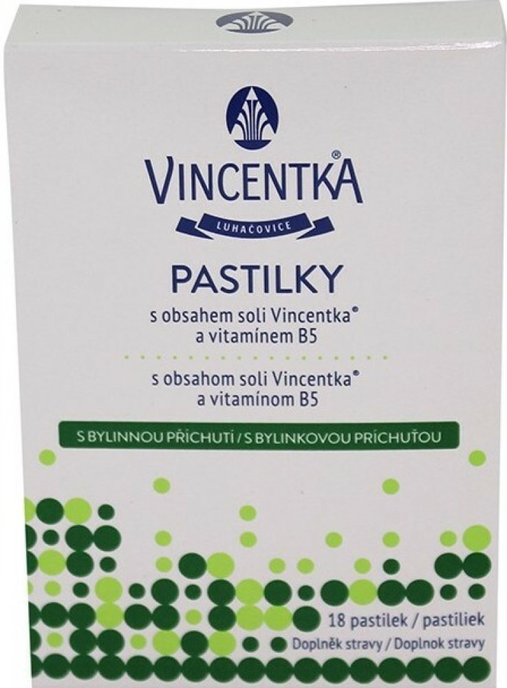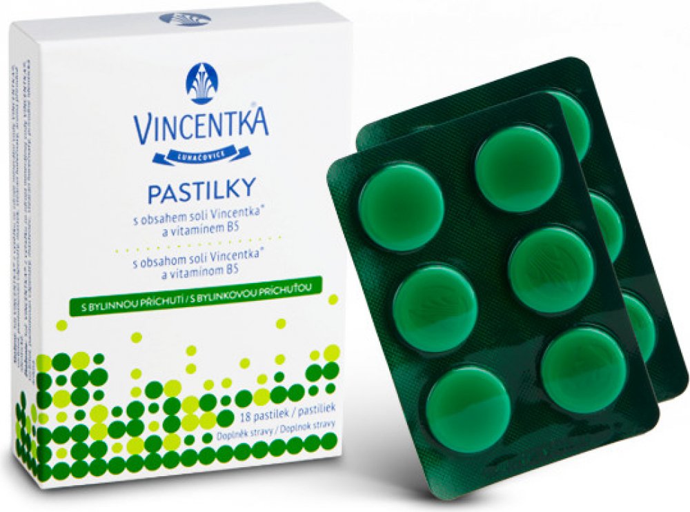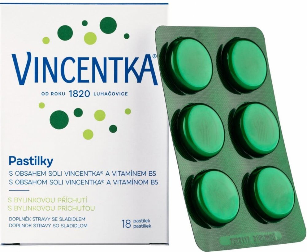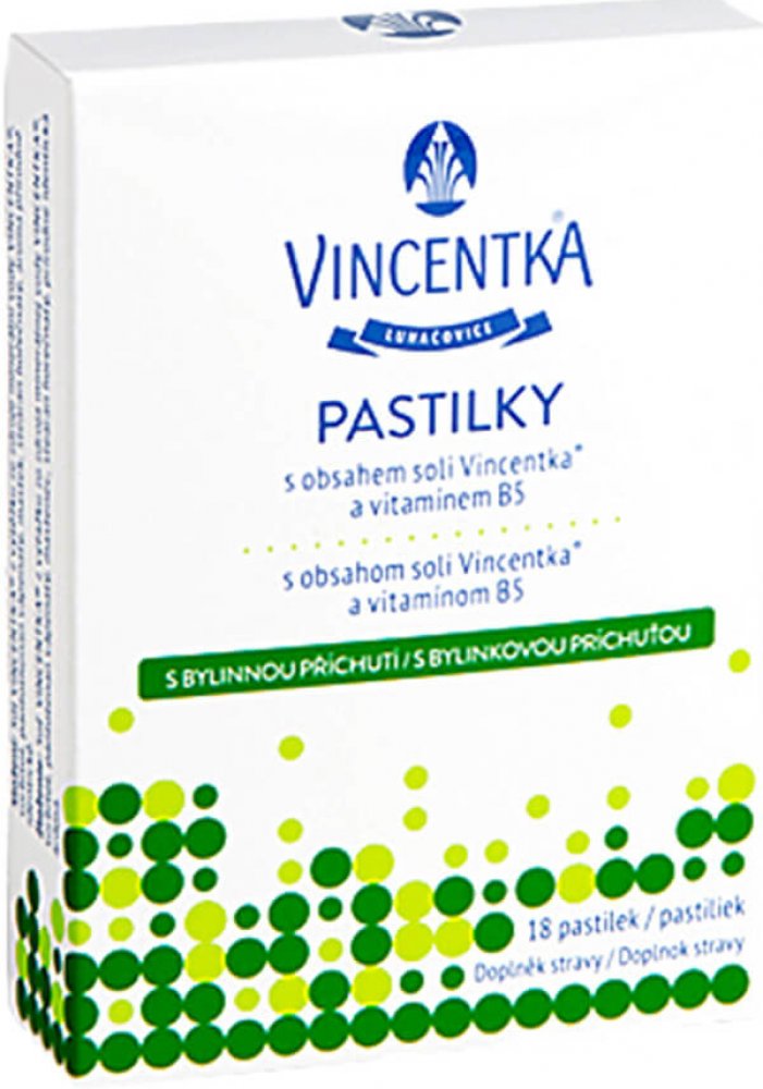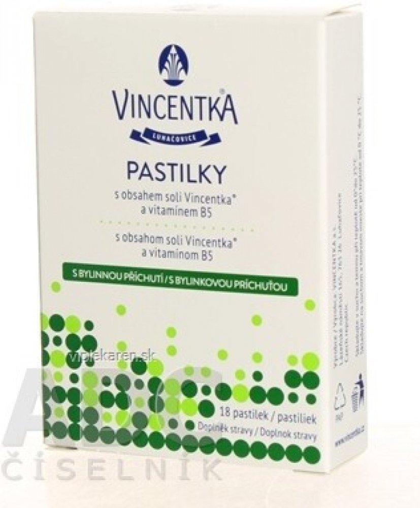 Vincentka 18 tbl pastilky krk, nos a dutina ústní unisex 40 g Vincentka pro dospělé perorální od 3 let bylinky Česká republika zrak, uši a ústa 2 Kdykoliv Nejvýše 8 za den Nespecifikováno s vitamínem B5