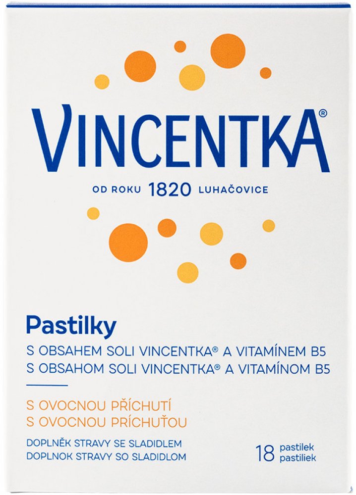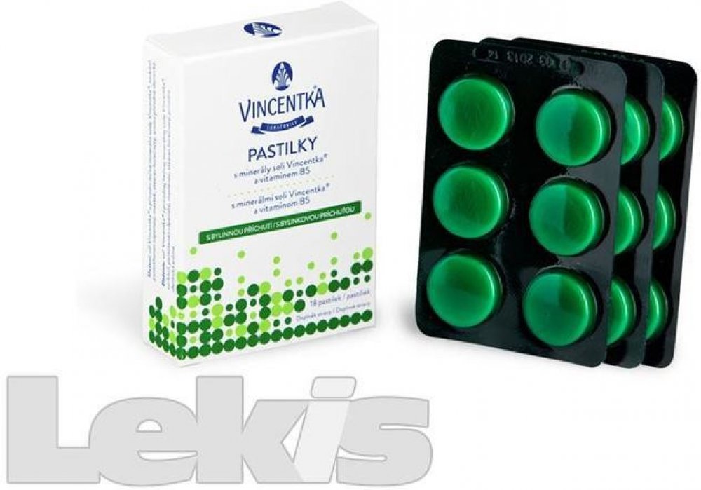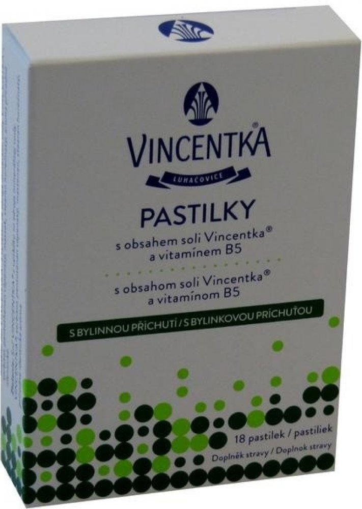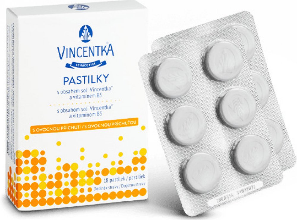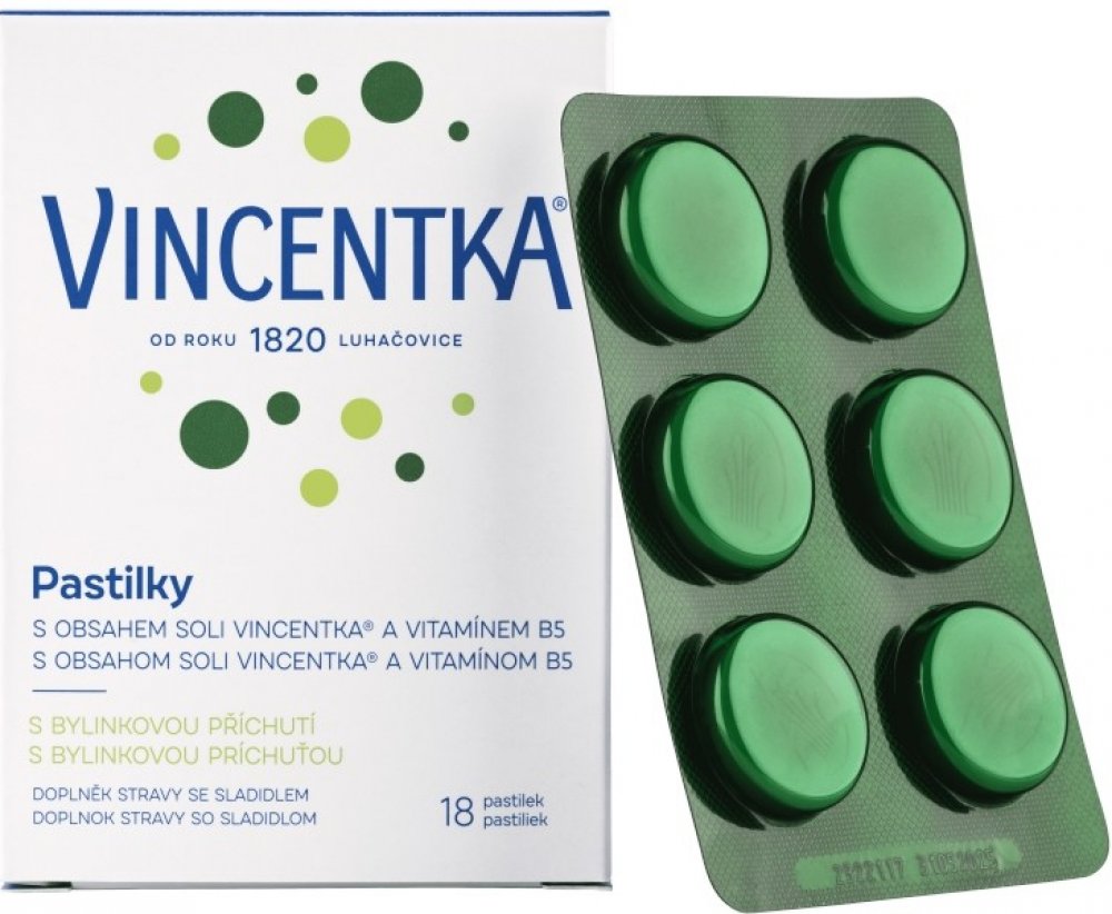 Vincentka 18 tbl pastilky krk, nos a dutina ústní unisex 40 g Vincentka pro dospělé perorální od 3 let bylinky Česká republika zrak, uši a ústa 2 Kdykoliv Nejvýše 8 za den Nespecifikováno s vitamínem B5