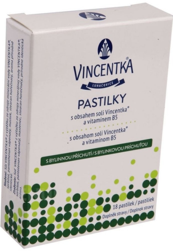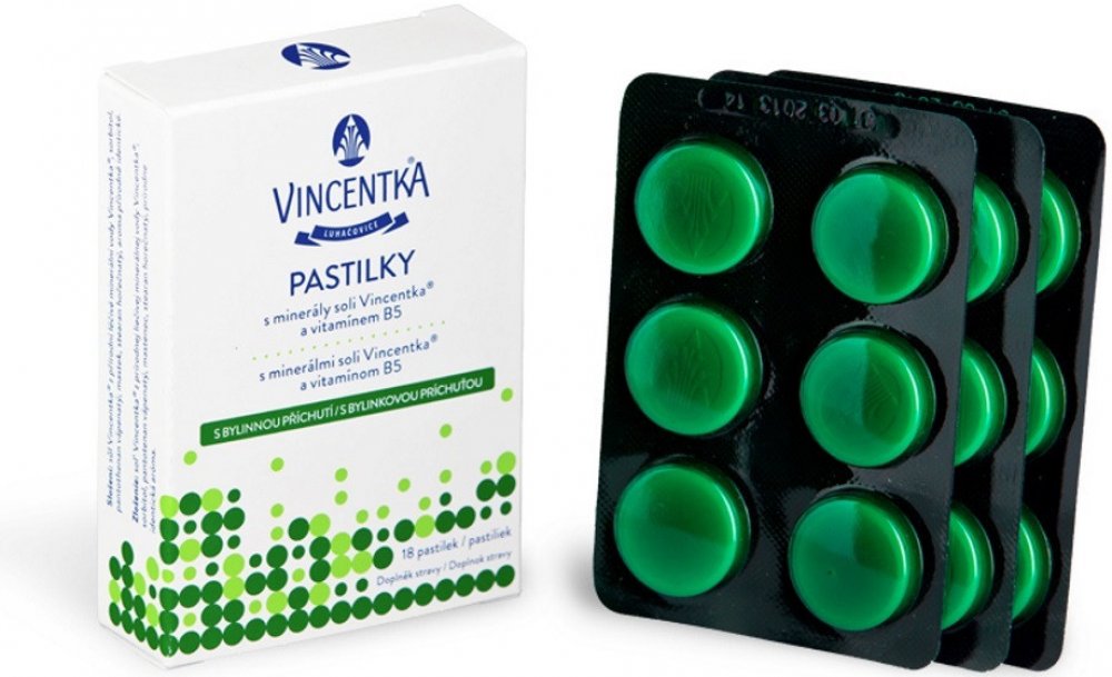 Vincentka pastilky s ovocnou nebo bylinnou příchutí je doplňkem stravy. Určeno pro péči o sliznici dutiny ústní a nosohltanu. Produkt z minerální vody Vincentka z přírodního léčivého zdroje...