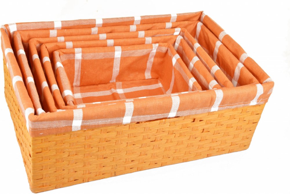 Oranžové úložné boxy z provázků mají drátěnou konstrukci a po stranách dva otvory, díky nimž se snadnou přenášejí a jednoduše se s nimi manipuluje. Koše jsou vystlané oranžovou látkou s bílými pruhy, které tvoří čtverce. Textilii lze vyndavat a prát. Vybírat můžete z mnoha velikostí, podle toho, které se vám hodí a na co je chcete využívat. Vypadají báječně v policích, na poličce i konferečním stolku a často se využívají i ve skříních na třídění prádla, hraček i dokumentů. Informace o produktu: úložné boxy upletené z provázku drátěná konstrukce oranžová barva oranžovo-bílá vnitřní pratelná látka koše mají tvar kvádru jsou lehké a prodyšné 2 otvory na přenášení a snadnou manipulaci výběr z několika velikostí i sad Vaše výhoda a užitek: vyrobeny z přírodního materiálu, který by neměl chybět v žádné domácnosti krásná oranžová barva rozjasní každý interiér výběr z mnoha velikostí i sad za zvýhodněnou cenu košíky lze lehce přenášet z místa na místo – na 2 protějších stranách jsou otvory za které se box snadno uchopí úložné boxy jsou oblíbené pro svou širokou škálu využití – třídění, ukládání i uklízení věcí slaďte svůj domov oranžovými doplňky – vybrat můžete koš na prádlo, obaly na květináče a papírové kapesní, úložné boxy s víkem i úložné bedny