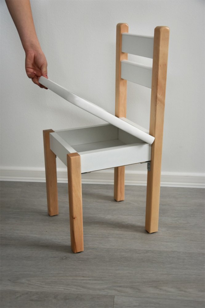 Kvalitně propracovaná do nejmenšího detailu: Je bytelná, ale zároveň lehká a i vaši nejmenší si ji lehce kamkoli přenesou. Sedátko, přihrádka a opěrátko jsou vyrobené z laminové nábytkové desky, díky čemuž se židlička velmi snadno udržuje v čistotě. Stačí ji jen otřít vlhkým hadříkem. Nohy jsou vyrobeny z masivního olšového dřeva. Všechny použité nátěrové barvy splňují veškerá požadovaná schválení a jsou zcela bezpečné pro děti.