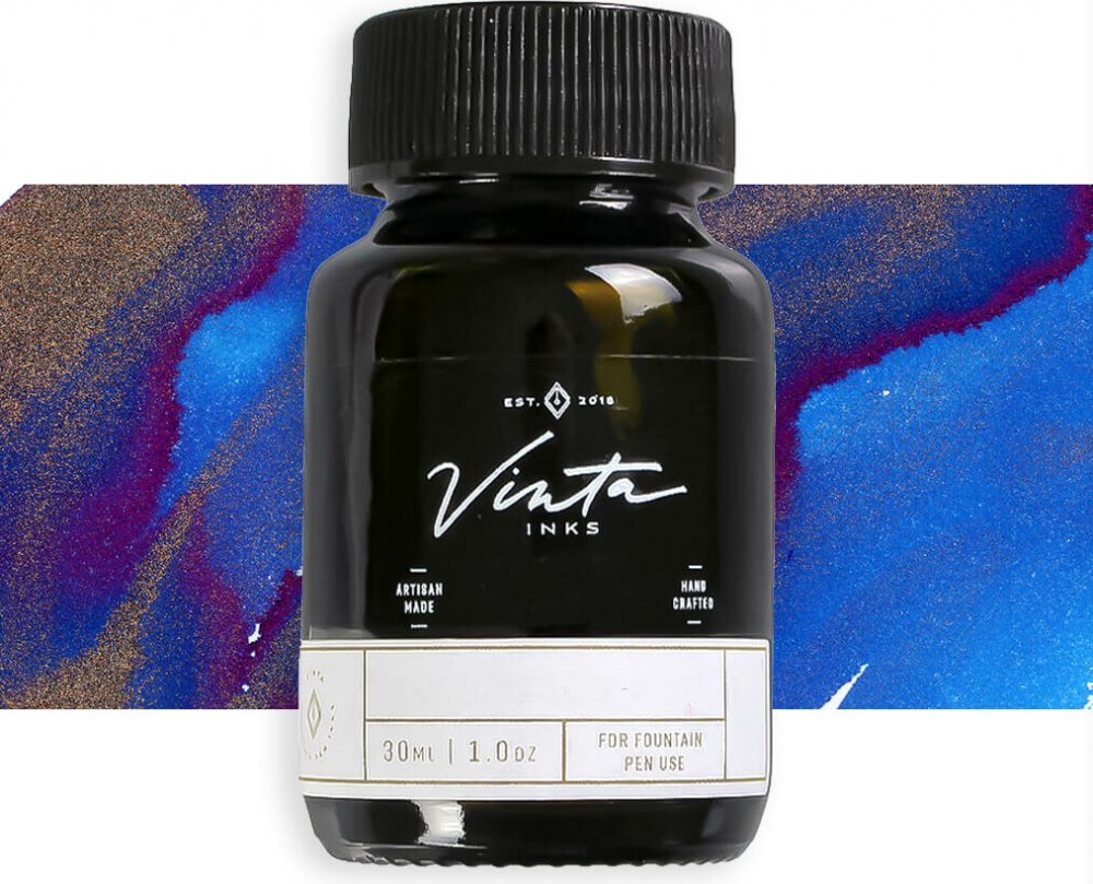 Skleněná lahvička kouřové barvy s inkoustem je pečlivě zabalena v papírové krabičce se zlatou ražbou. Inkoust je rychleschnoucí, na vodní bází - není voděodolný. Svým složením jsou inkousty Vinta vhodné pro plnicí pera i kaligrafii.