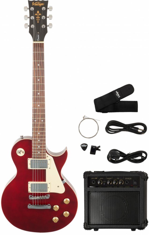 Elektrický kytarový komplet Kytarový komplet Vintage V10 Coaster Series Guitar Pack obsahuje elektrickou kytaru, kytarové kombo Kinsman s výkonem 10W, obal, kytarový popruh, nástrojový kabel, klipovou ladičku, trsátko a náhradní set strun. Vintage V10 Coaster Series Gloss Black je elektrická kytara v single-cut tvaru populárních “elpéček”. Tělo nástroje je zhotoveno z lípy. K javorovému krku je přilepen palisandrový hmatník osazený dvaadvaceti pražci. Dva humbuckery s keramickými magnety a voskováním, navržené britským kytarářem Alanem Entwistlem, nabízí širokou paletu zvuků, které vyniknou v neméně pestré škále hudebních stylů - country, blues, popu, jazzu i rocku. Charakter zvuku upravíte pomocí dvou potenciometrů hlasitosti, dvou tónových clon a třípolohového přepínače snímačů. Stabilní ladění zaručuje uchycení strun v chromovaných Die-Cast mechanikách a přes kobylku TOM se šesti nastavitelnými sedly ve struníku. Stylové zpracování podtrhují tradiční prvky v podobě lemovky v provedení aged cream, pickguardu a pozičních teček na hmatníku. Elektrické kytary firmy Vintage nabízí za velmi atraktivní cenu výborné zpracování i parametry, které byste našli i u mnohem dražších modelů. Jde o skvělou volbu pro začínající hráče, ale díky zvuku a hernímu komfortu je ocení i pokročilí kytaristé.