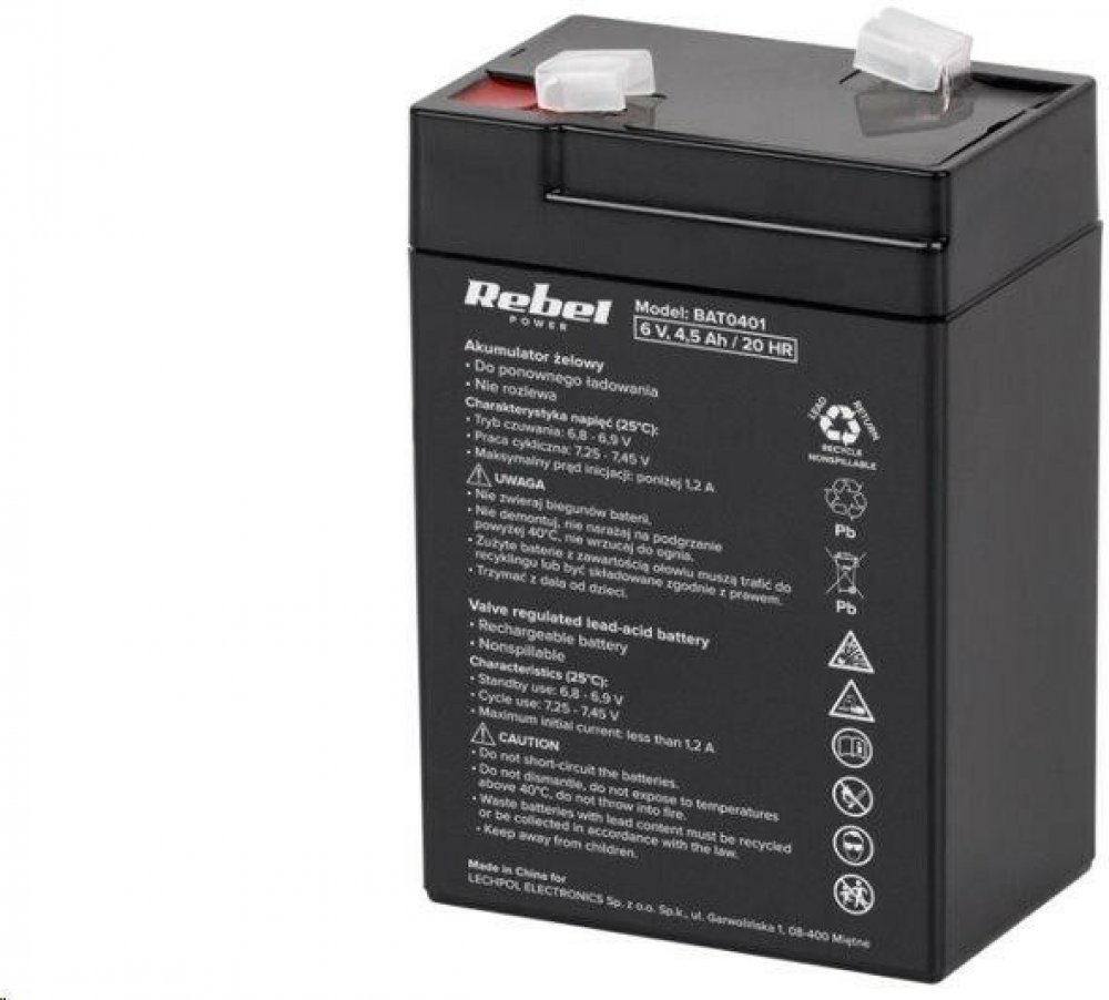 Baterie olověná 6V 4.0Ah VIPOW Olověné hermeticky uzavřené a zcela bezúdržbové akumulátory. Konstrukce těchto akumulátorů umožňuje libovolnou pracovní polohu. Doporučené oblasti použití: systémy UPS, záložní zdroje pro veškeré aplikace EZS a telekomunikace, záložní svítidla a nabíjecí svítilny, výstražná mobilní a signalizační zařízení apod. Technické údaje: Napětí: 6 V Kapacita: 4 Ah Rozměry: 100 x 48 x 70 mm Hmotnost: 0.65 kg Režim "standby" (25°C): 6.8-6.9 V Cyklovač (25°C): 7.25-7.45 V Maximální proud zahájení: Vnitřní odpor (plně nabitá baterie, 25°C): 19 m? Kapacita (25°C) - 20 hodin: 3.3 Ah - 10 hodin: 3.14 Ah - 5 hodin: 2.77 Ah - 1 hodina: 1.98 Ah Vliv teploty na kapacitu: + 40°C: 102 % + 25°C: 100 % 0 °C: 85 % - 15°C: 62 % Automatické vybití (25°C) Kapacita po 3 měsících skladování: 91 % Kapacita po 6 měsících skladování: 82 % Kapacita po 9 měsících skladování: 64 %
