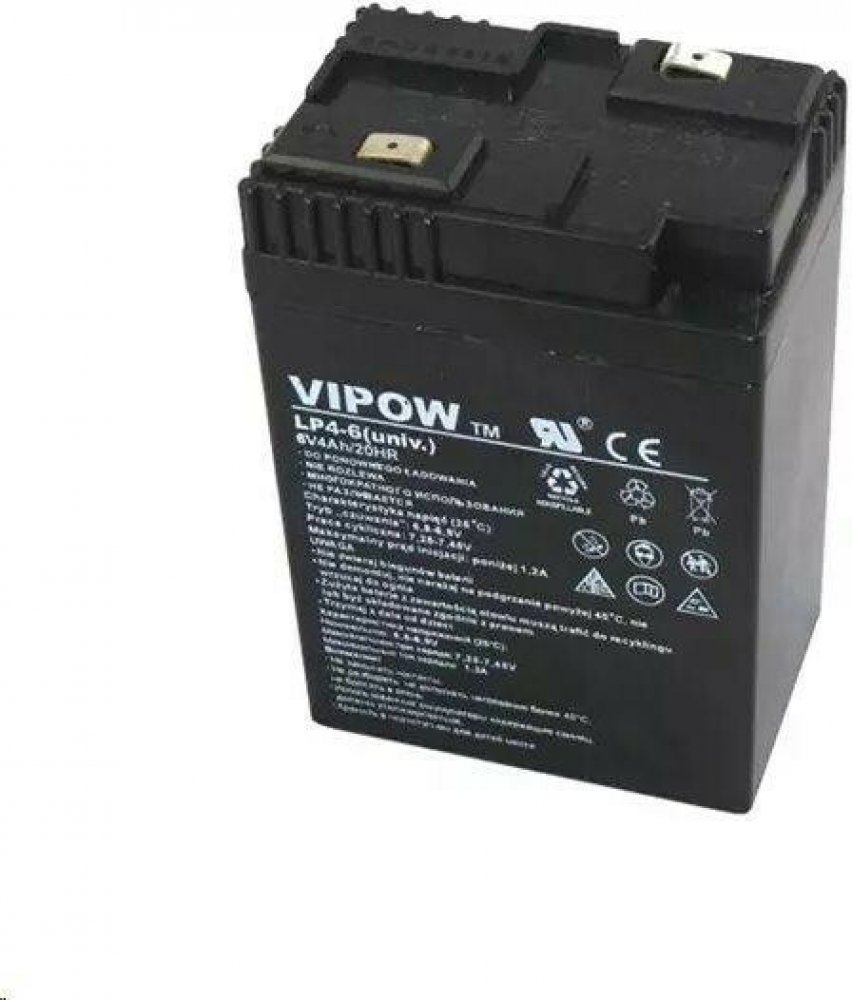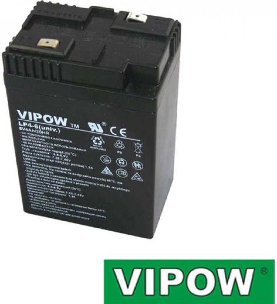 Baterie olověná 6V 4.0Ah VIPOW Olověné hermeticky uzavřené a zcela bezúdržbové akumulátory. Konstrukce těchto akumulátorů umožňuje libovolnou pracovní polohu. Doporučené oblasti použití: systémy UPS, záložní zdroje pro veškeré aplikace EZS a telekomunikace, záložní svítidla a nabíjecí svítilny, výstražná mobilní a signalizační zařízení apod. Technické údaje: Napětí: 6 V Kapacita: 4 Ah Rozměry: 100...