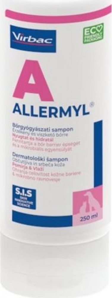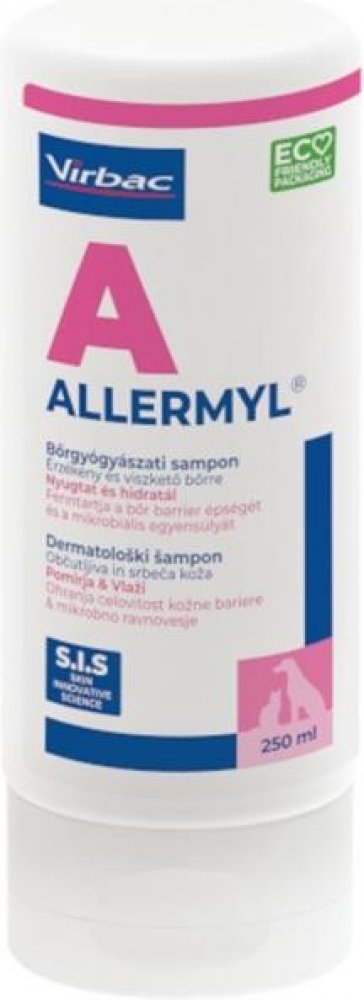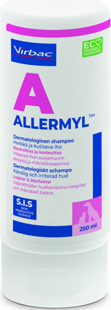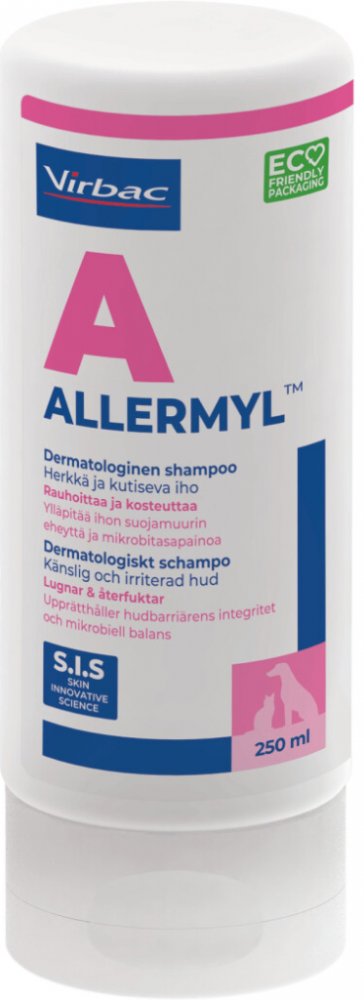 Allermyl je jemný, hypoalergenní dermatologický šampon bez mýdla určený k častému použití a optimalizaci stavu kůže a srsti psů a koček všech věkových kategorií s citlivou a svědivou kůží. Obsahuje technologii S–I–S (Skin–Innovative–Science) a Skin Lipid Complex (komplex kožních lipidů).