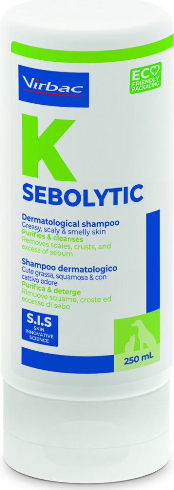 Šampon Sebolytic odstraňuje šupinky, krusty a nadbytek kožního mazu na povrchu kůže psů a koček. Současně neutralizuje nepříjemné pachy. Obsahuje S-I-S technologii. Optimalizovaný dávkovací systém pro snadnou aplikaci.