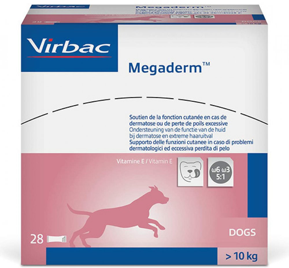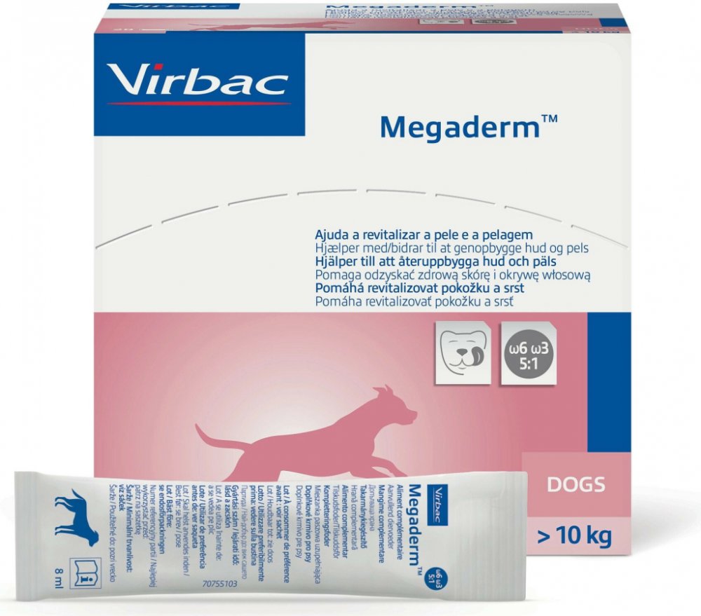 Vysoce účinné složení Virbac Megaderm obsahuje esenciální mastné kyseliny a vitamin E. Tyto složky podporují zdravou kůži a lesklou srst psů a koček. Tento doplněk stravy je balen v praktických jednodávkových sáčcích a lze jej podávat jak zdravým zvířatům, tak zvířatům trpícím kožními poruchami. Nejenže podporuje epidermální bariéru a kvalitu srsti, ale také zmírňuje svědění a omezuje záněty a zároveň zabraňuje nadměrnému tvorbě kožního mazu a rohovatění. Obsah sáčku o objemu 4 ml nebo 8 ml jednoduše vmíchejte do krmiva vašeho zvířete. Kombinace slunečnicového, rybího a pupalkového oleje nabízí ideální poměr omega-6/omega-3 5:1, díky čemuž je vysoce účinná. Kromě protizánětlivých účinků podporují vysoce kvalitní mastné kyseliny také regeneraci kůže. V neposlední řadě je tento doplněk ideální v případě alergie nebo léčby kortizonem. Charakteristika přípravku Virbac Megaderm pro psy a kočky : doplněk stravy pro psy a kočky ideální pro zvířata s kožními problémy nebo k léčbě kožních onemocnění podporuje zdravou kůži a lesklou srst : optimální směs olejů a vitaminu E optimální poměr omega-6/omega-3 (5:1 ): esenciální mastné kyseliny ze slunečnicového, rybího a pupalkového oleje, vyvážené pro vysokou účinnost zmírňuje chronické svědění protizánětlivý účinek : na bázi protizánětlivých složek posiluje epidermální bariéru : podporuje přirozenou regeneraci a ochranu pokožky pomáhá předcházet nadměrnému tvorbě kožního mazu a rohovatění : lokální ošetření kerato-seboroických stavů ideální při alergiích : zmírňuje kožní reakce ideální jako doprovodná terapie: ideální doplněk léčby na bázi kortizonu nebo jiných protizánětlivých léků jednodávkové sáčky: zajišťují stabilitu složek a snadné podávání k dispozici ve dvou formátech: 4 ml sáčky pro kočky a psy s hmotností do 10 kg nebo 8 ml sáčky pro psy s hmotností nad 10 kg formulováno odborníky na zdraví zvířat: Laboratoře Virbac vytvářejí přípravky pro zdraví zvířat již od roku 1968. Tento rodinný podnik, který je uveden na seznamu, je známý svou kvalitou i inovativními recepturami.