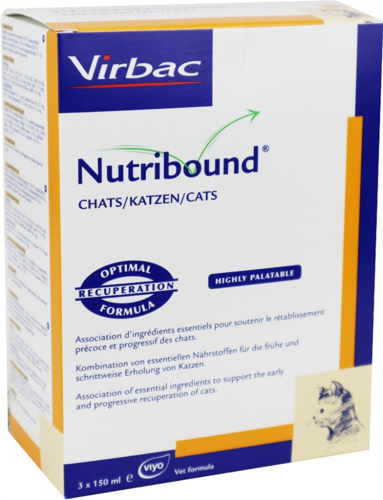- 2 - Pokračování: po 48 hodinách je zapotřebí začít podávat krmivo. Ke zvýšení tolerance u silně postižených zvířat se kromě Nutriboundu doporučují souběžně podávat malé a opakované dávky vysoce energetických a stravitelných živin (např. Nutri-plus gel od Virbacu).