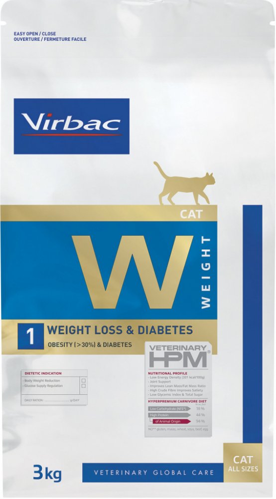 Toto dietní suché krmivo má nízký obsah energie a celkový obsah cukru. Díky tomu je krmivo Virbac Veterinary HPM Cat Weight Loss & Diabetes W1 vhodné i pro kočky trpící cukrovkou. Díky vysokému obsahu bílkovin a vlákniny je toto dietní krmivo příjemně syté a navíc podporuje udržování svalové hmoty. V neposlední řadě dodává toto dietní krmivo pro kočky cenné omega mastné kyseliny, které jsou nezbytné pro správnou funkci kůže.