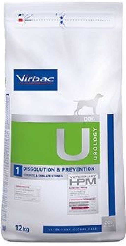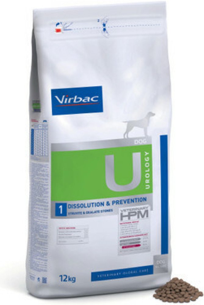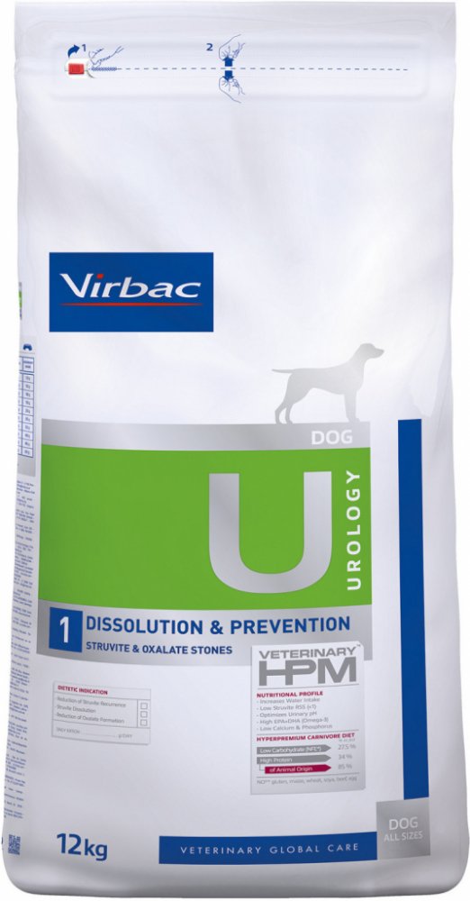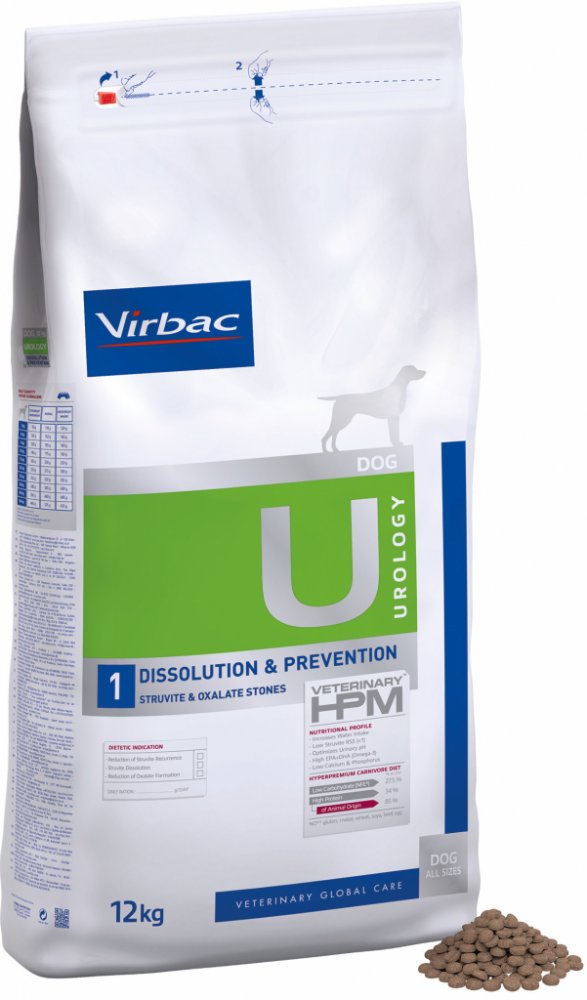 Dietní suché krmivo Virbac se vyznačuje vlastnostmi alkalizujícími moč. Spolu s nízkou hladinou vápníku a vitaminu D může pomoci snížit tvorbu oxalátových kamenů. Virbac Veterinary HPM Dog Urology Dissolution & Prevention U1 má také nízký obsah hořčíku, který snižuje tvorbu nových struvitových kamenů a podporuje jejich rozpouštění.