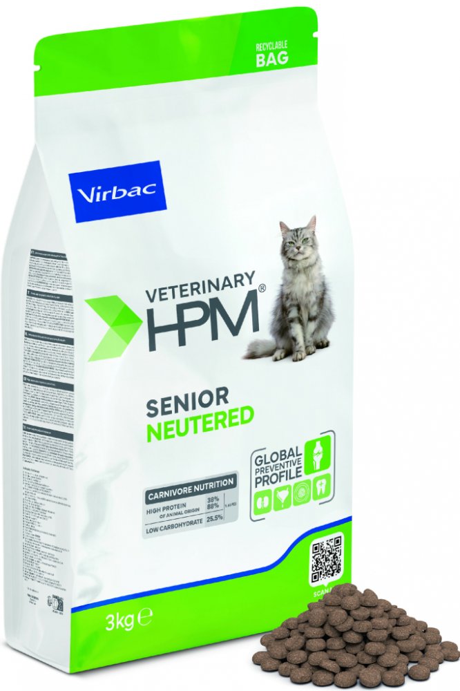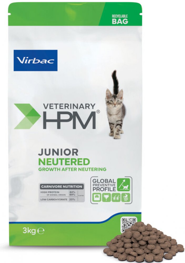 Jakmile je vaše mladá kočka sterilizována nebo vykastrována, změní se její metabolismus a s ním i její nutriční nároky. Virbac Veterinary HPM Junior Neutered Cat je nízkoalergenní suché krmivo se středním obsahem energie, které splňuje potřeby této fáze růstu. Virbac Veterinary HPM Junior Neutered Cat obsahuje velké množství živočišných bílkovin, které jsou důležité pro svalovou hmotu vaší kočky. Obsahuje také speciální směs vlákniny, která udržuje vašeho mazlíčka sytého a spokojeného mezi jednotlivými jídly. Díky cenným pre- a probiotikům podporuje krmivo pro kočky také optimální trávení a přirozenou střevní flóru. Virbac Veterinary HPM Junior Neutered Cat: Kompletní suché krmivo pro kastrované a sterilizované mladé kočky do 1 roku věku Mírný obsah energie: méně tuku, pro snadnější regulaci hmotnosti po kastraci/sterilizaci Bohaté na živočišné bílkoviny: vysoký obsah bílkovin podporuje optimální růst svalů Zvýšený obsah vlákniny: podporuje dobré zasycení mezi jídly Normální močový trakt: podporuje pití, přizpůsobený obsah minerálních látek, může podporovat vstřebávání vody a přispívat k optimálnímu pH moči Vysoká stravitelnost: snížený obsah škrobu, prebiotika a probiotika podporují optimální toleranci trávení a přirozenou střevní flóru Kůže a srst: bohaté na esenciální omega-3 a -6 mastné kyseliny pro normální stav kůže a lesklou srst Dentální hygiena: askorbylfosfát sodný může snížit riziko tvorby zubního kamene Nízký obsah alergenů: bez kukuřice, pšenice, lepku, sóji, vajec, hovězího masa a ryb S L-karnitinem