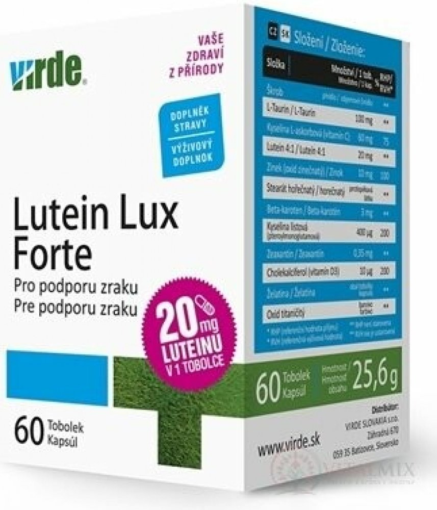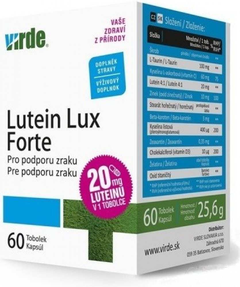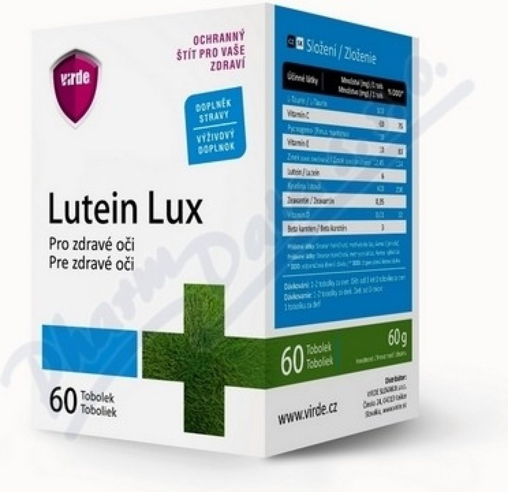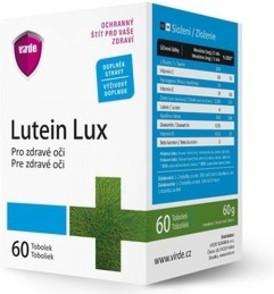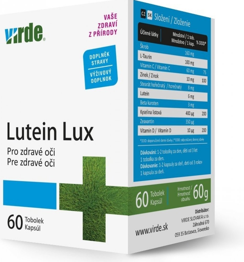 Přípravek Lutein LUX je určen pro podporu zraku. Základem receptury jsou karotenoidy betakaroten, lutein a zeaxanthin, zinek, obsažen je rovněž L-taurin. Zinek pomáhá udržovat normální stav zraku, spolu s vitaminem C přispívají k ochraně buněk před oxidačním stresem.