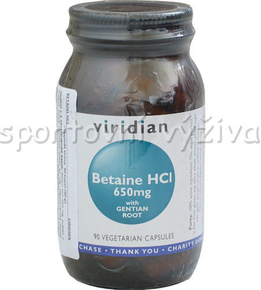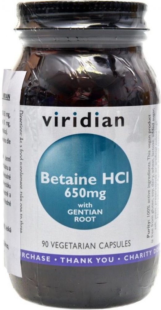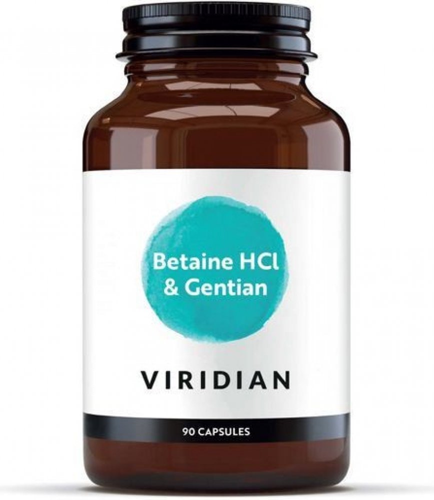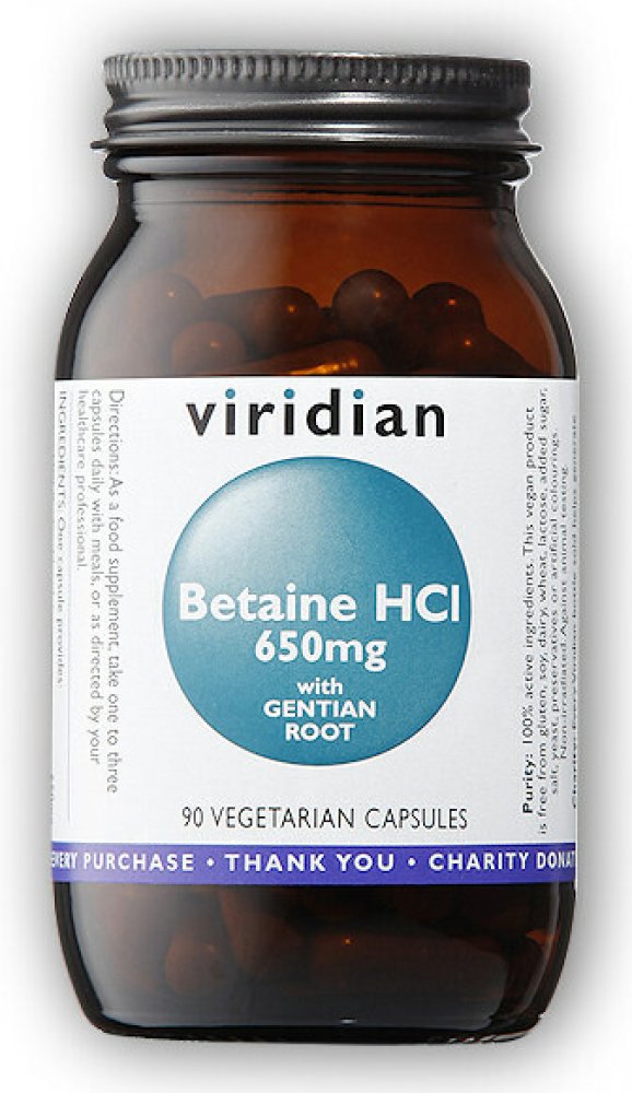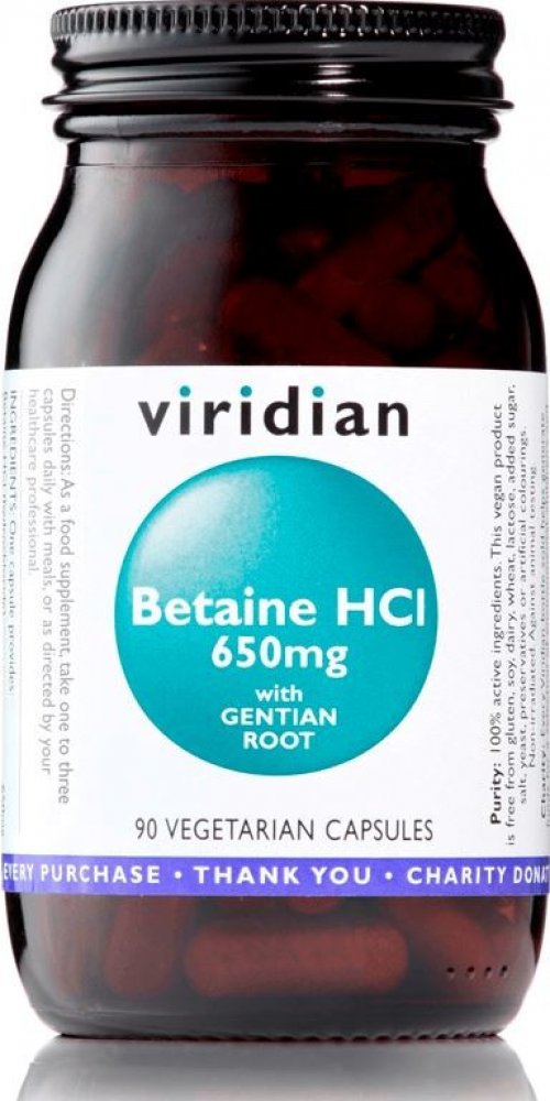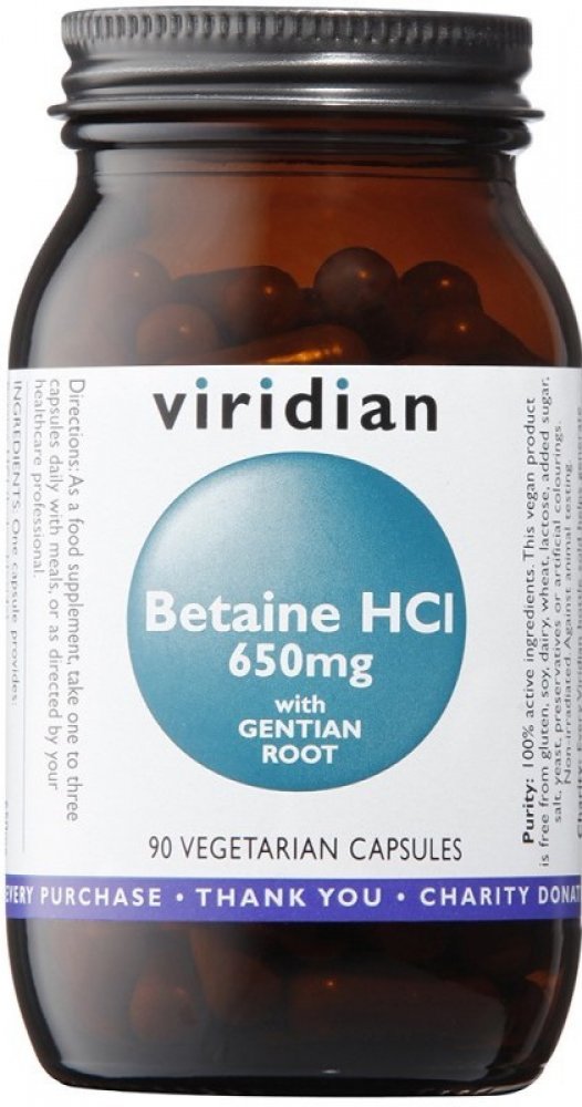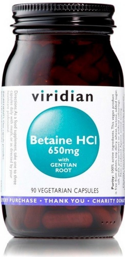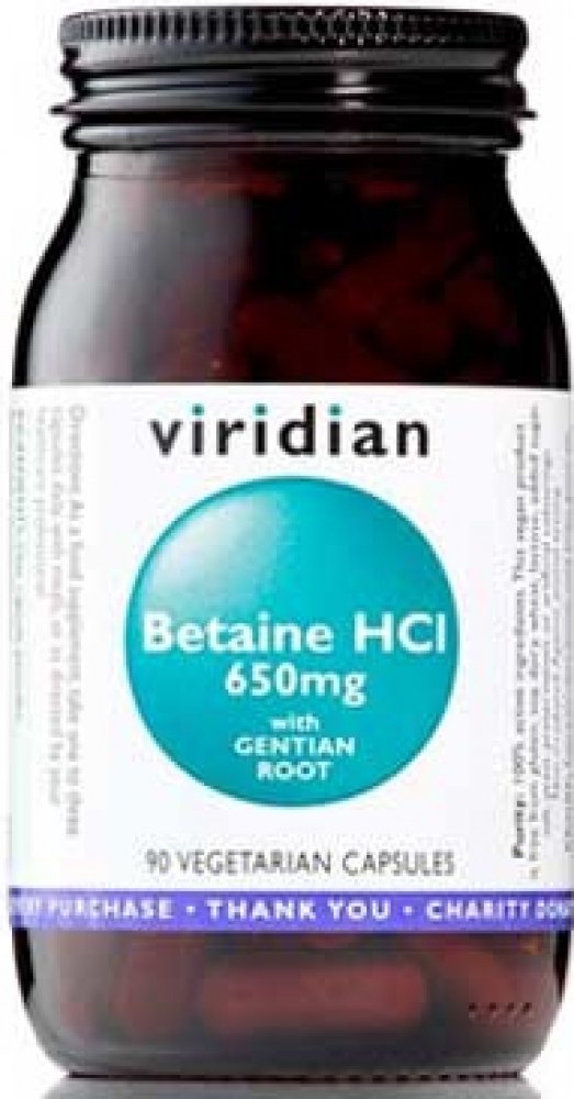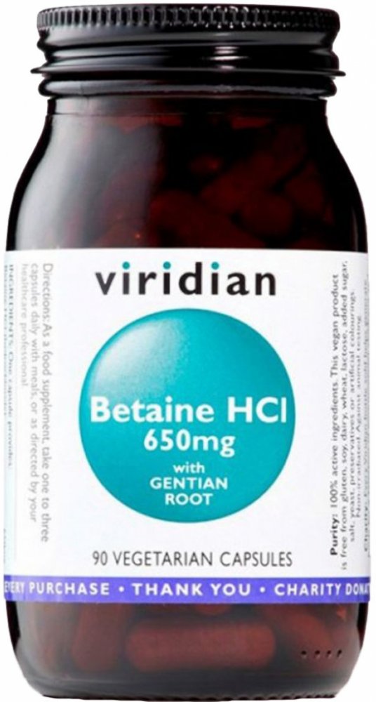 Ve Viridian Betain HCl a kořenu hořce je obsaženo velmi dobře účinné spojení Betainu kyseliny chlorovodíkové a kořene hořce. Betain přispívá ke správné látkové přeměně homocysteinu. Hořec může přispět k normálním trávícím funkcím.