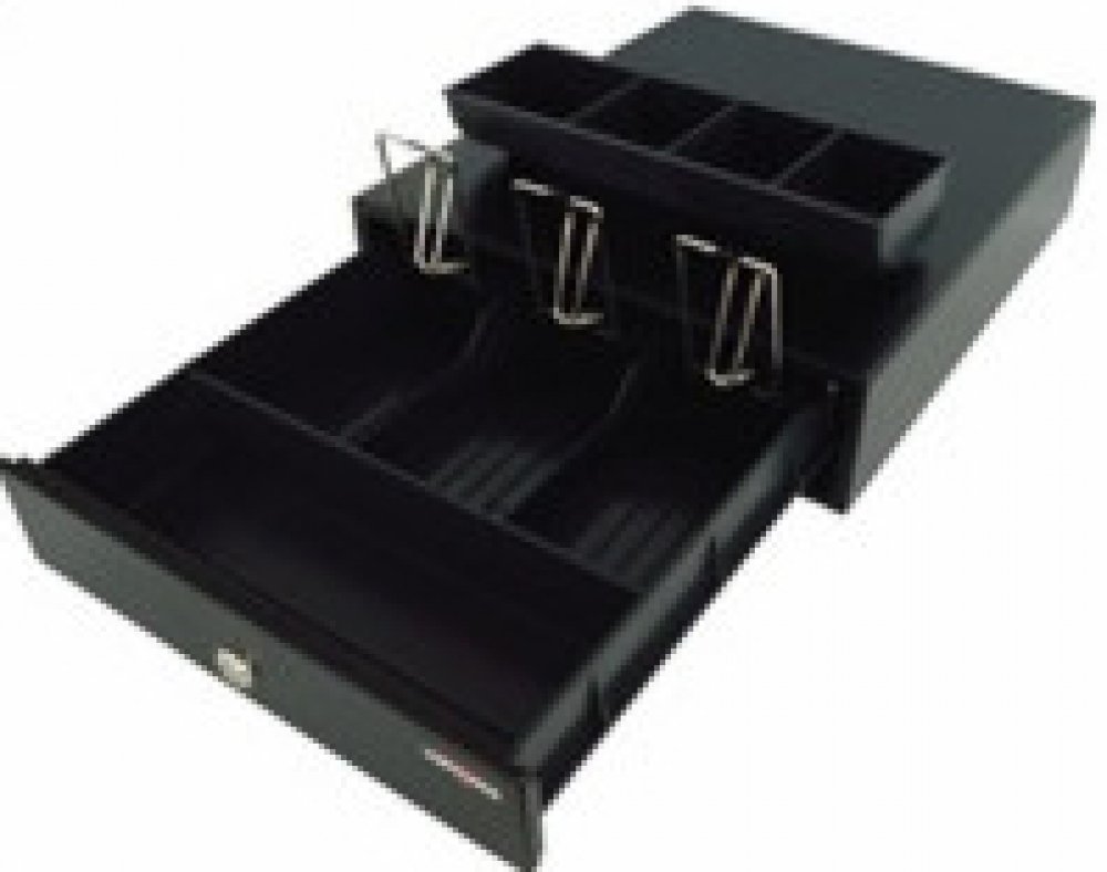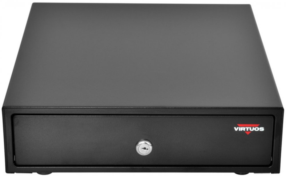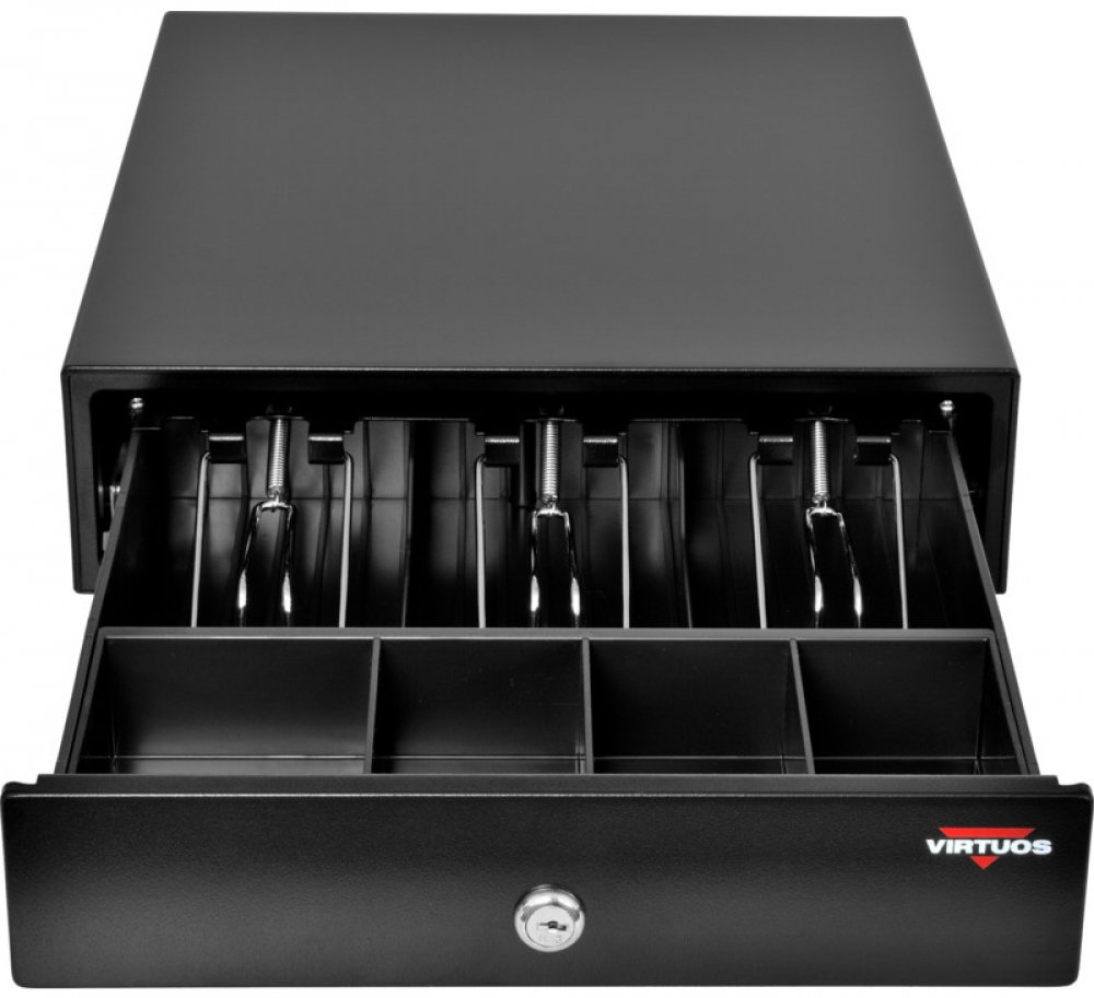 Pokladní zásuvka VIRTUOS mikro EK-300C v černém provedení, kovovými držáky bankovek, s kabelem RJ12 24V a pořadačem 3x bankovky a 4x mince