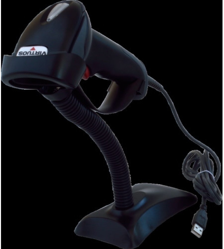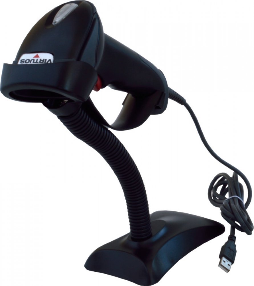 Laserová ruční čtečka čárových kódů VIRTUOS HT-900A s USB připojením a stojanem.