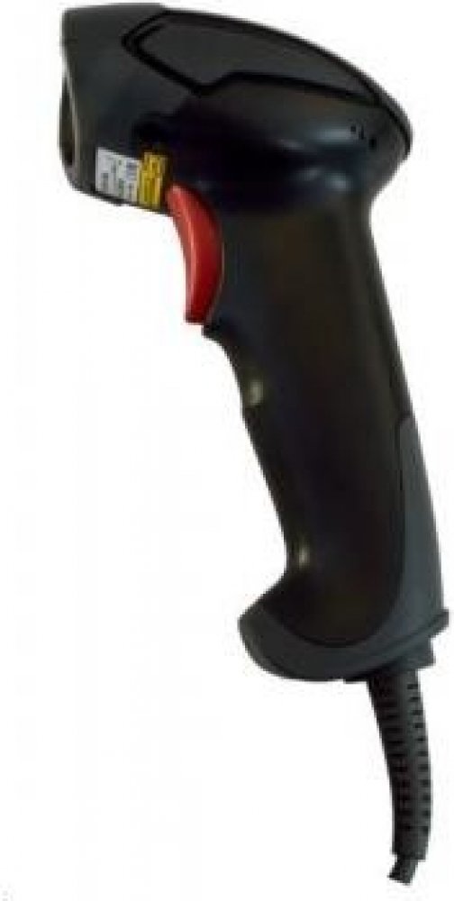 Laserový ruční snímač čárového kódu v černé barvě umožňující automatickou detekci přítomnosti kódu, dodávaný včetně stojánku.